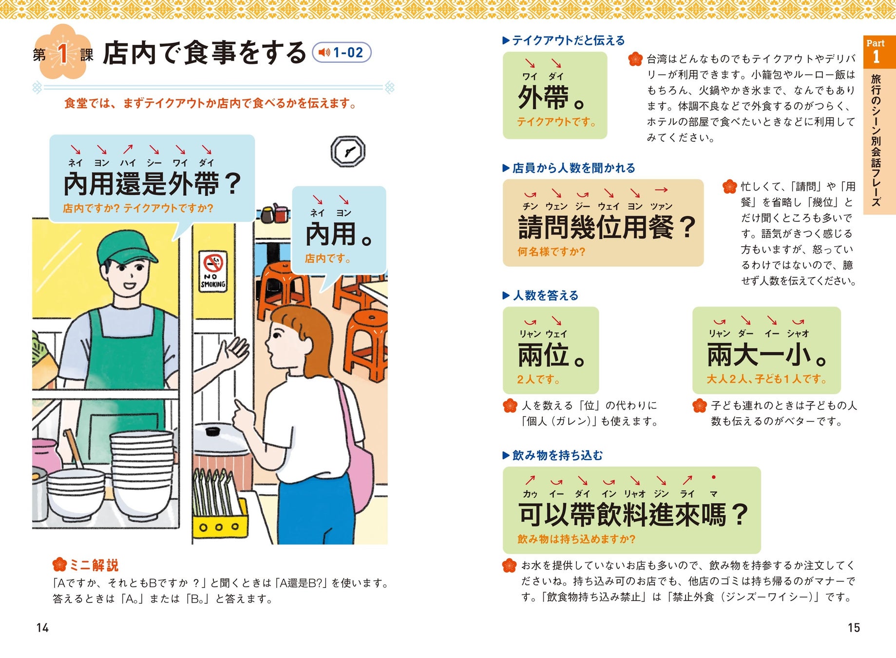 食堂や夜市、観光、買い物、移動など台湾旅行でのシーンごとの会話フレーズをイラストとともに紹介しています。