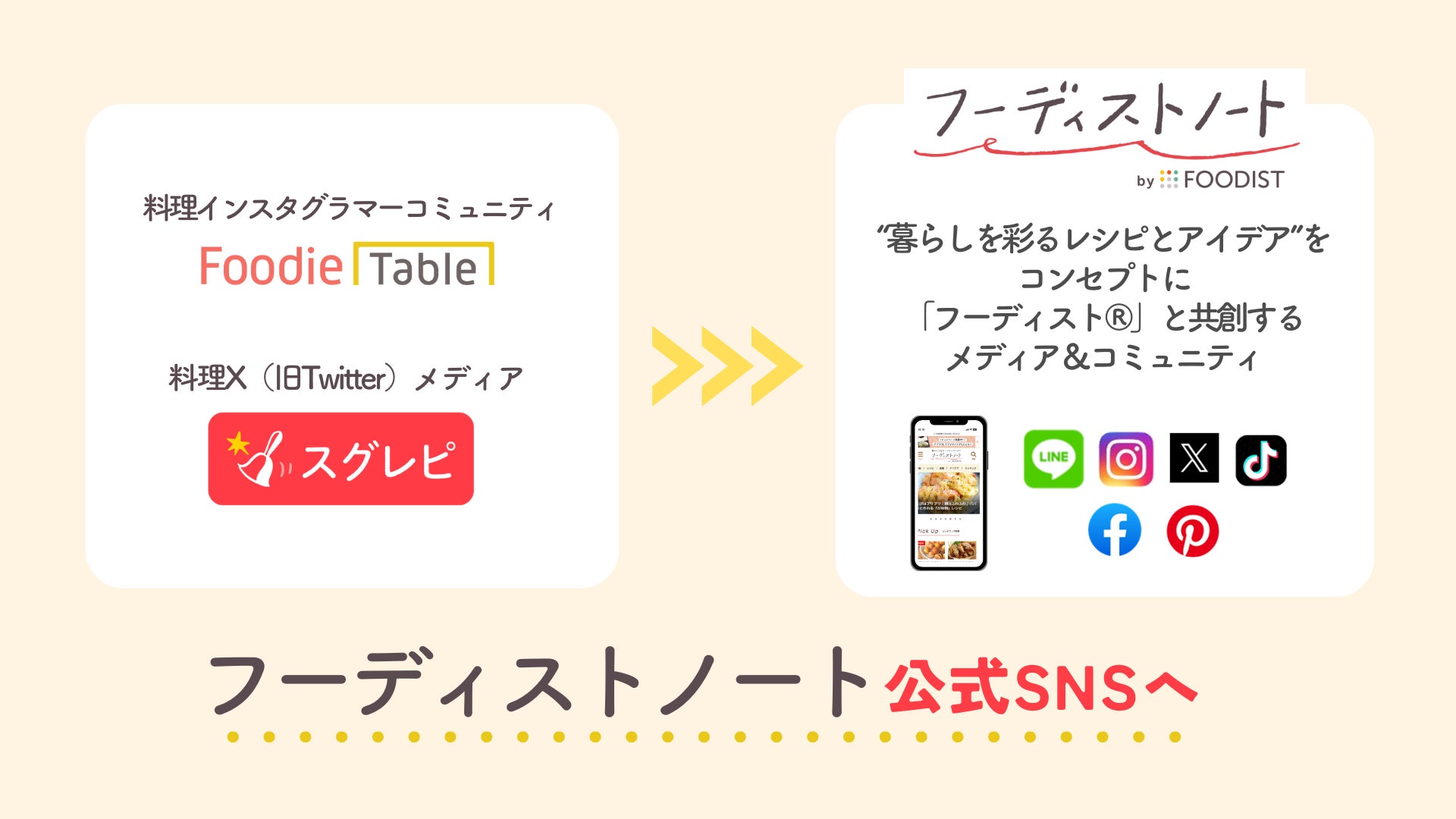 今回、「フーディストノート」のブランド強化のため、「フーディーテーブル(Instagram)」「スグレピ(X)」を「フーディストノート」の公式SNSとしてアカウント統一いたしました。これにより、“暮らしを彩るレシピとアイデア”をコンセプトに、フーディスト®と共創するメディア&コミュニティとして「フーディストノート」をアップデートいたします。