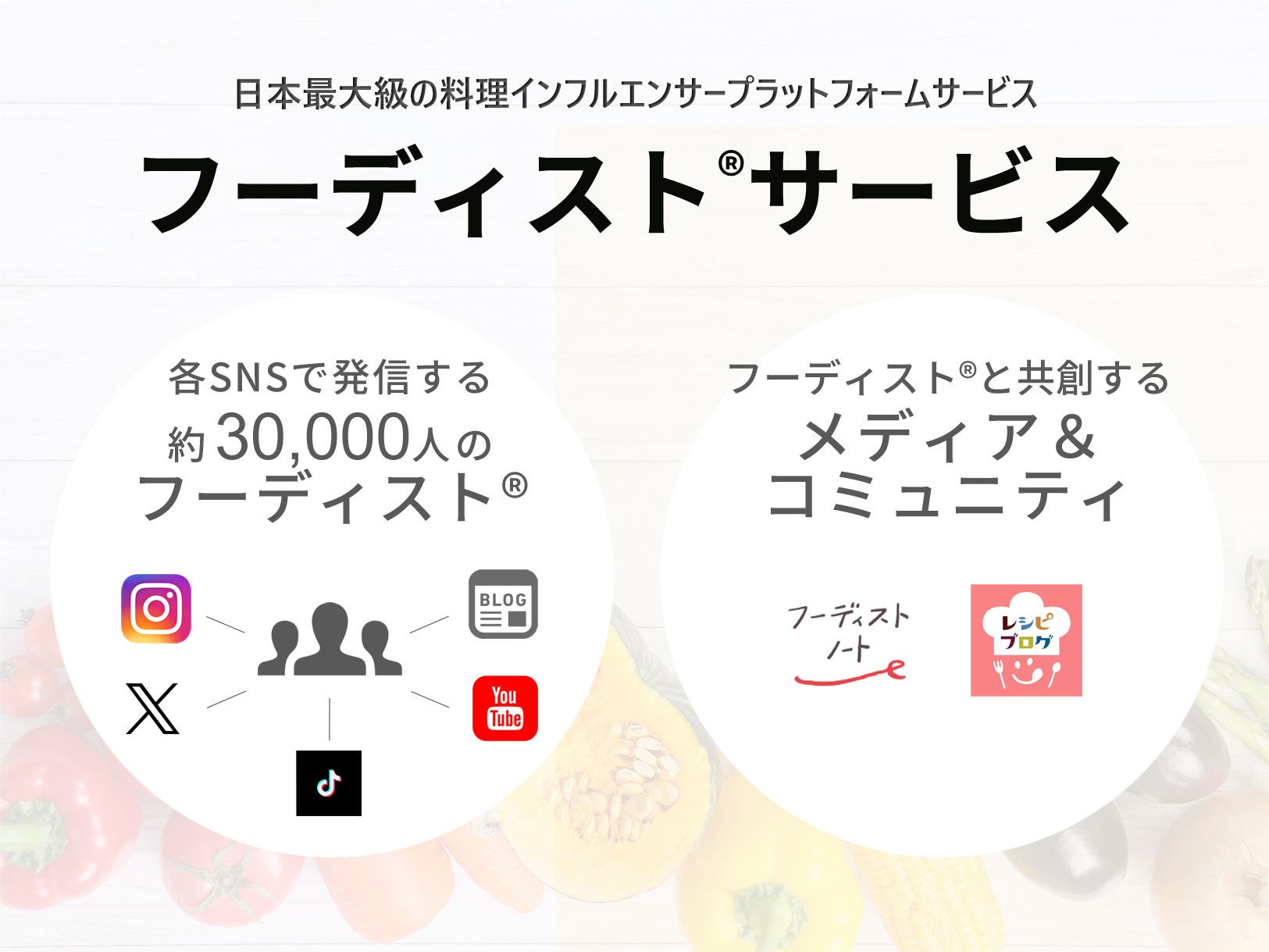 「フーディストサービス」ではInstagramやX(旧Twitter)、YouTubeやブログなどのSNSで、日々楽しみながら料理や暮らしについて発信している料理インフルエンサー・料理クリエイターである「フーディスト®」約3万人が活躍するメディア&コミュニティを運営しています。