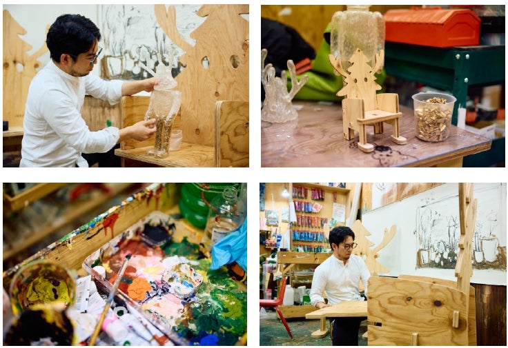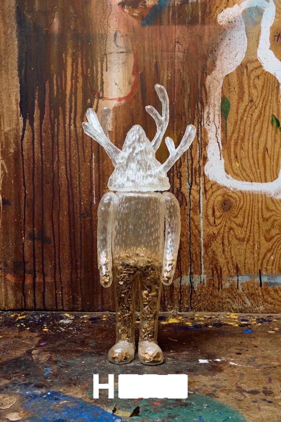 今回のイベントのメインピースである透明のソフビの内部にあるゴールドの粒は、廃棄物からできています。昨今、持続可能社会やリサイクルの重要性を感じさせられる場面が増えてきていると思います。