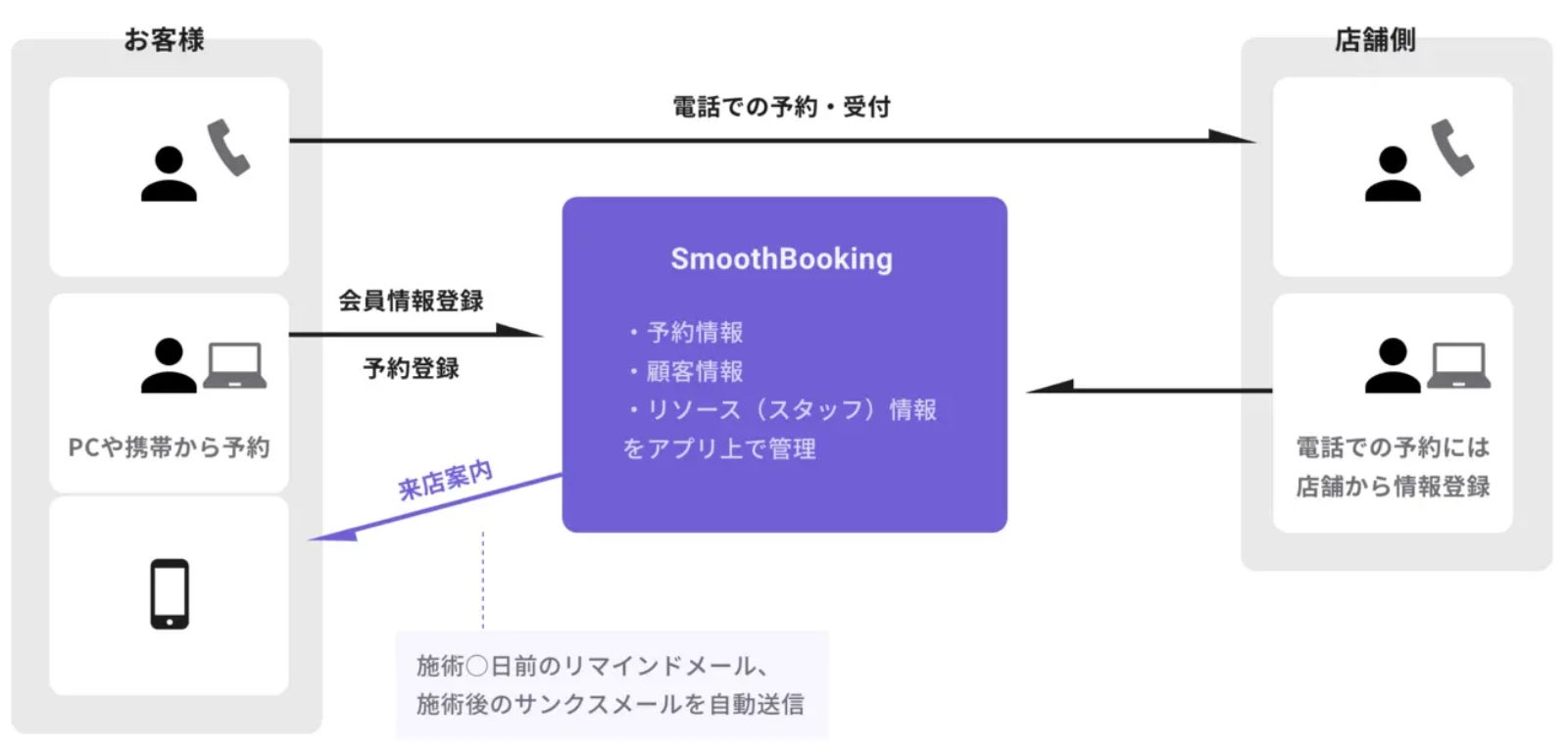 今回のアップデートにより、会員向けの先行予約が可能になるほか、予約回数の制限やキャンセル受付など商材や顧客に応じた細かいオプション設定が可能となり、販売機会を増やすことができます。さらに、オンライン予約だけでなく電話予約も一括管理できるようになり、管理画面から既存の顧客データを参照して、電話予約もすぐに顧客データと紐付けられるようになりました。