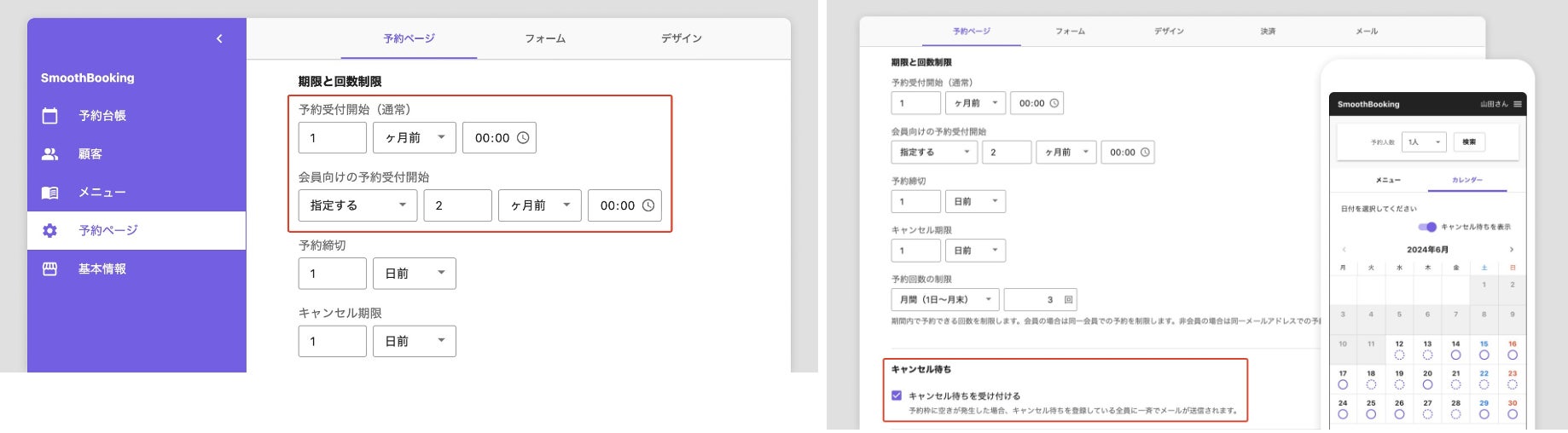 会員と非会員で別の予約開始日を設定できるようになりました。会員向けの受付日を早めに設定することで、先行予約機能として利用できます。時間の設定も可能です。