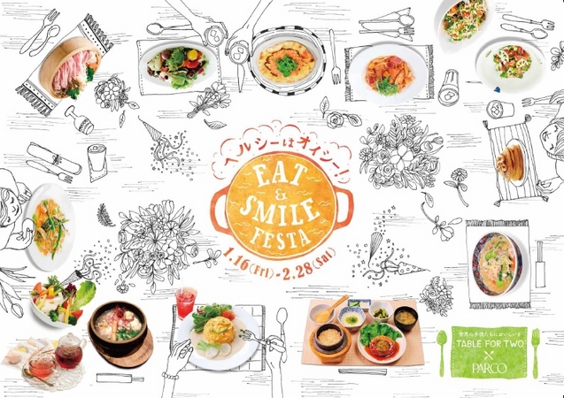 株式会社パルコ(以下、当社)は、2015年1月16日より全国パルコ15店舗館内飲食店にて心と体が笑顔になるメニュー企画「ヘルシーはオイシー! EAT&SMILE FESTA」(以下、本企画)を開催。世界の食の不均衡を解消し、開発途上国と先進国双方の人々の健康を同時に改善することを目指す活動「TABLE FOR TWO」(以下、TFT)と連動し、対象メニュー1品につき1食分を開発途上国の子ども達へ届ける。