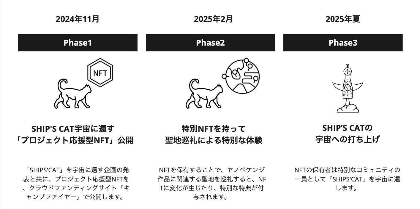 現代美術家ヤノベケンジ氏の「物語」の中に登場する、地球での任務を完了したSHIP'S CATに感謝し、物語の終わりに、今度は人類の力と技術でSHIP'S CATを宇宙に還すプロジェクトです。「SHIP’S CAT」は、困難な状況からの生存と再生を象徴しています。今回のNFTプロジェクトでは、SHIP’S CATを再び宇宙に送り出すことで、人類の再生と未来への希望を表現し、宇宙へRE:VERSE(新たな誕生)させるものとなります。RE:VERSEは、単なる復活ではなく、新しいスタートを切ることを象徴しています。SHIP’S CATのストーリー、宇宙への「RE:VERSE」は、ビッグバンであり新しい始まりと未来への希望を示すものとなります。このプロジェクトを記念して、プロジェクト支援者に限定100体のスペシャルフィギュアを用意しました。このフィギュアには、特別なNFTがついており、SHIP'S CATの船員の一員としての印となるフィギュアとなります。購入者はこのNFT付きフィギュアを通じて、宇宙打ち上げプロジェクトの船員となり、売り上げはプロジェクトの実現に向けての資金となります。2025年夏に実際の打ち上げに向けた準備を進めており、支援者のみなさんと共に宇宙に飛ばす現場の立ち会いをして夢を叶えたいと思います。