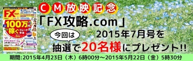キャンペーン期間において新規でユーロ/ドルを100万通貨以上お取引されたお客様で、申込みフォームよりお申込み頂いたお客様の中から抽選で今回は新CM放送を記念して20名様に月刊FX情報誌「FX攻略.com」(2015年5月21日発売)をプレゼント致します。