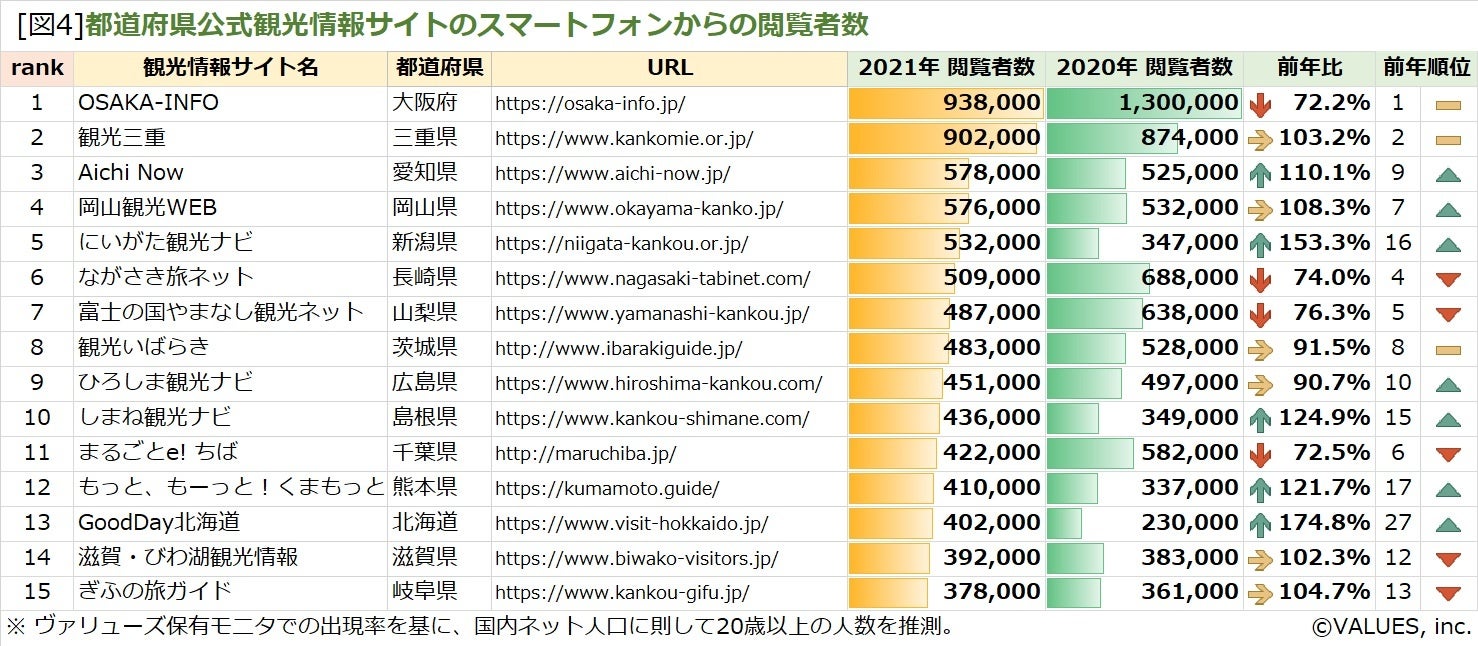 | 全国のヴァリューズモニター(20歳以上男女)の協力により、ヴァリューズが独自に定義する「旅行・交通」カテゴリのWebサイトおよび各都道府県公式観光情報サイトについて、2021年と2020年の年間閲覧者数を集計し比較を行った。さらに2021年の1年間において「観光」を含む検索語句とその検索者数を集計。 ※ランキング表内の「カテゴリ」はヴァリューズが独自に定義している。 ※サイト閲覧者数や検索者数はPCおよびスマートフォンからのアクセスを集計し、ヴァリューズが保有するモニタ内での出現率を基に、国内ネット人口に則して20歳以上の動向を推測。 ※一部の各都道府県公式観光情報サイトについては、リニューアル等に伴い、2021年と2020年でサイト名称やURLが変更されている場合があるが、2021年のものを掲載している。 |