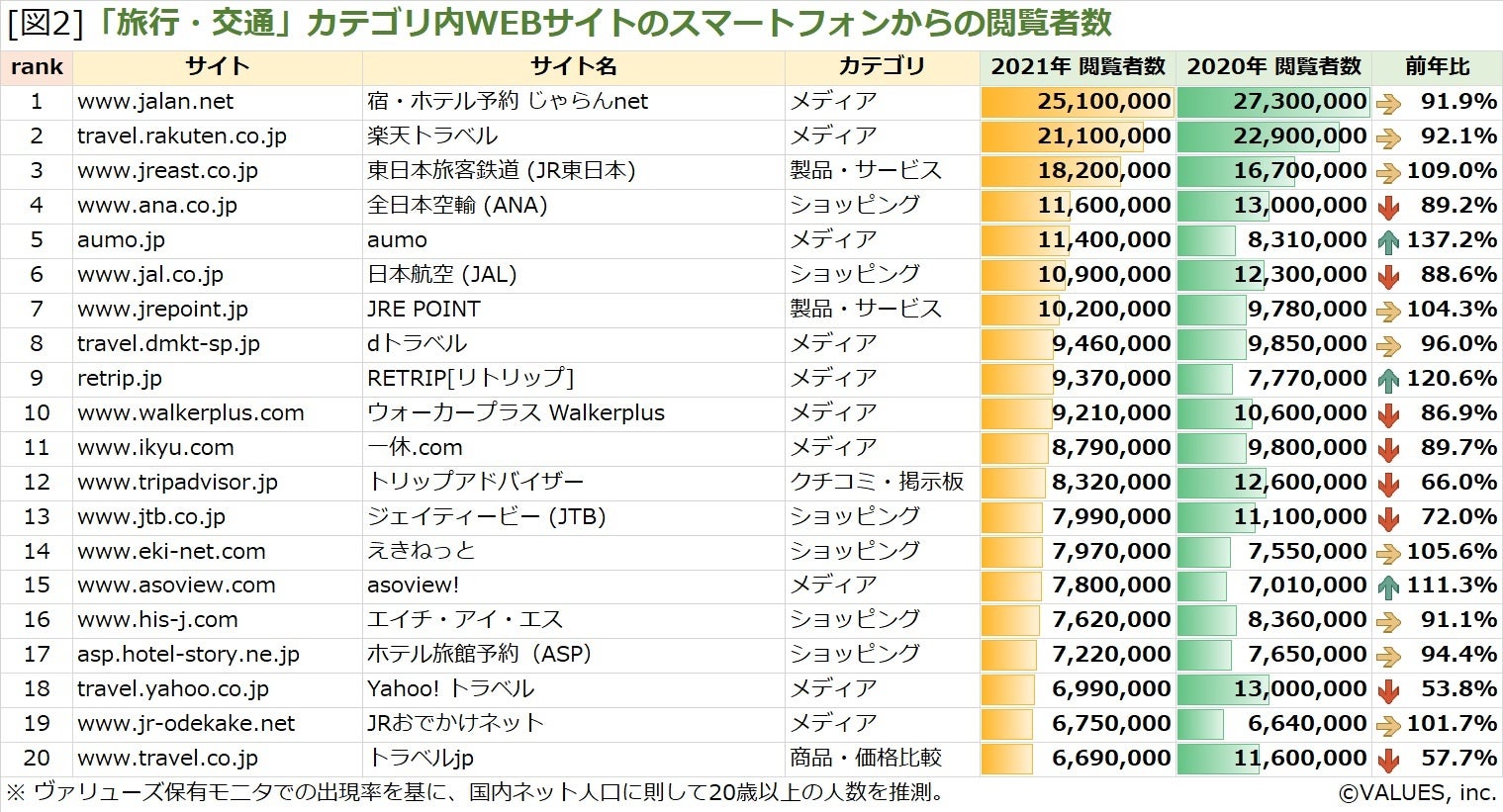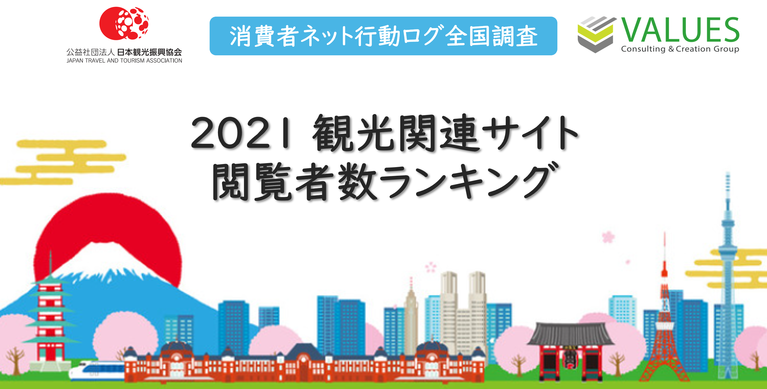 公益社団法人日本観光振興協会(本部:東京都港区、会長:山西 健一郎)と、ネット行動分析サービスを提供する株式会社ヴァリューズ(本社:東京都港区、代表取締役社長:辻本 秀幸)は協同で、2021年の観光関連Webサイトの年間閲覧者数を調査しました。