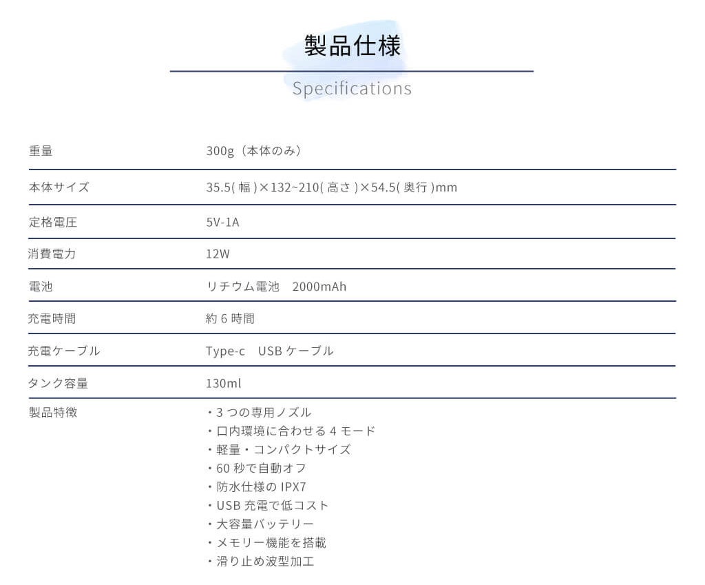 歯間の詰まりや歯周ポケットの汚れをジェット水流でピンポイント洗浄する『標準ノズル』、歯列矯正中の固定器具などで磨きにくい部分の汚れを集中クリーニングする『ブラシノズル』、細菌がたまりやすい舌表面を水と一緒にやさしく落とす『舌用ノズル」の3種を付属し、手のひらに乗るコンパクトサイズながら口内をすみずみまで爽快に。