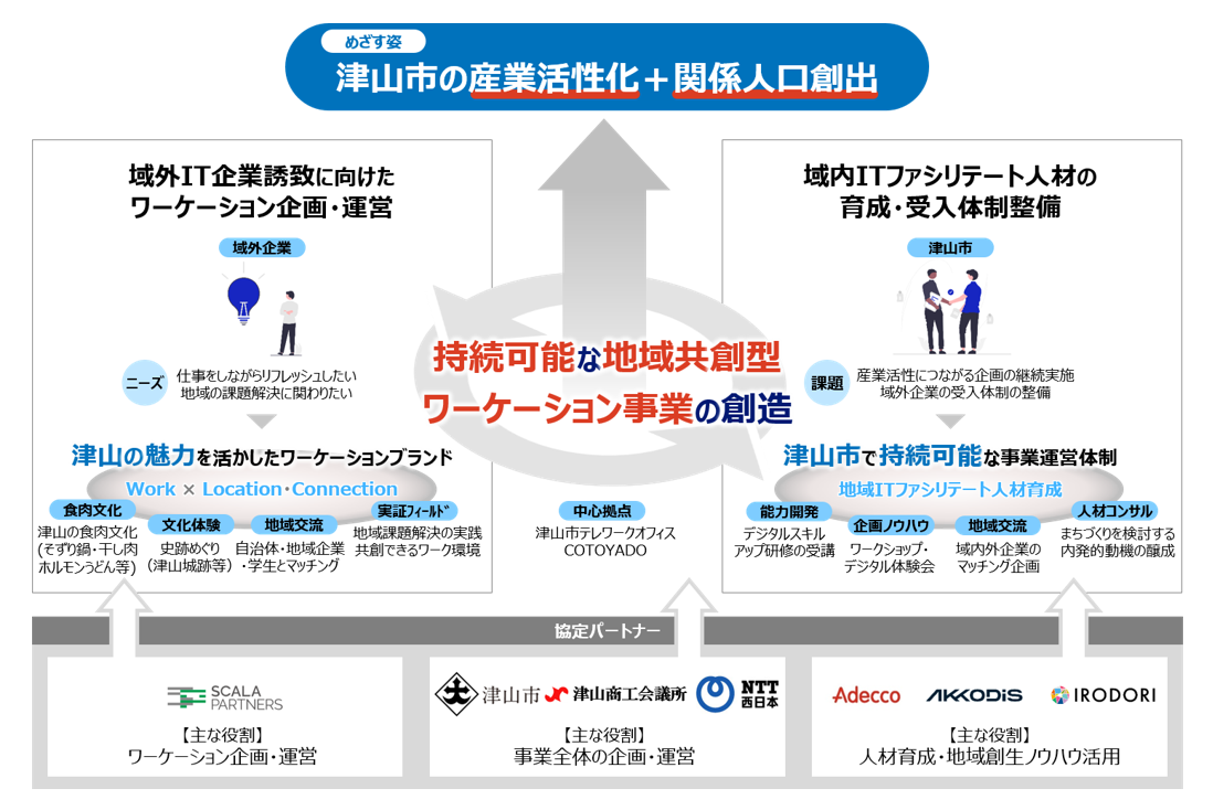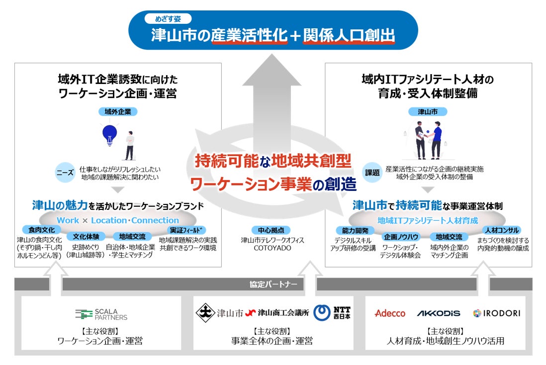 岡山県津山市(市⻑:谷口 圭三、以下「津山市」)と津山商工会議所(会頭:松田欣也、以下「商工会議所」)、西日本電信電話株式会社 岡山支店(支店長:西川 智洋、以下「NTT西日本」)、アデコ株式会社(代表取締役社長:川崎 健一郎、以下「アデコ」)、AKKODiSコンサルティング株式会社(代表取締役社長:川崎 健一郎、以下「AKKODiSコンサルティング」)、株式会社IRODORI(代表取締役社長:谷津 孝啓、以下「IRODORI」)、株式会社スカラパートナーズ(代表取締役社長:梛野 憲克、以下「スカラパートナーズ」)の7者は、津山市の産業活性化と関係人口の創出をめざし、連携協定を締結します。