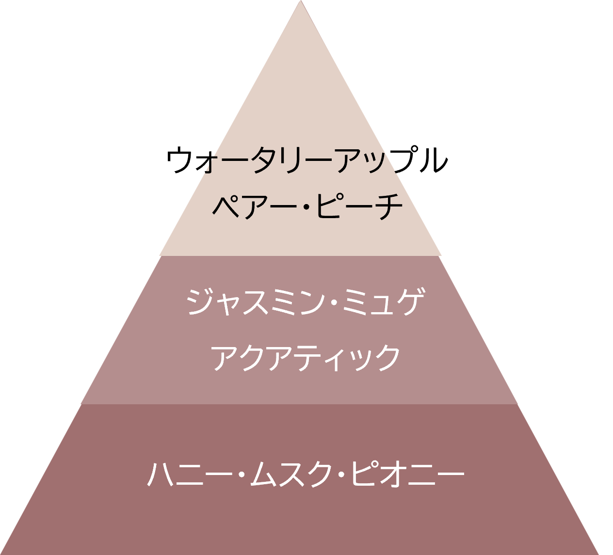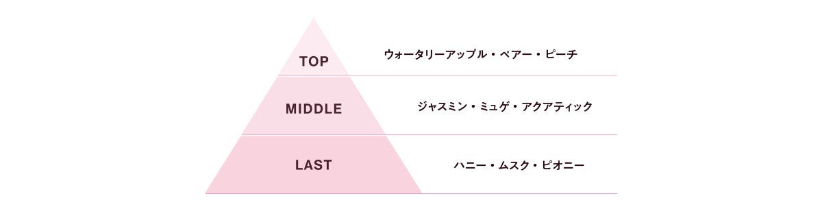 透明感のあるウォータリーアップル、ペアーに上質で華やかなジャスミン、ミュゲを合わせ、やわらかなハニーとサボンでまとめた透き通るような香りを採用しました。