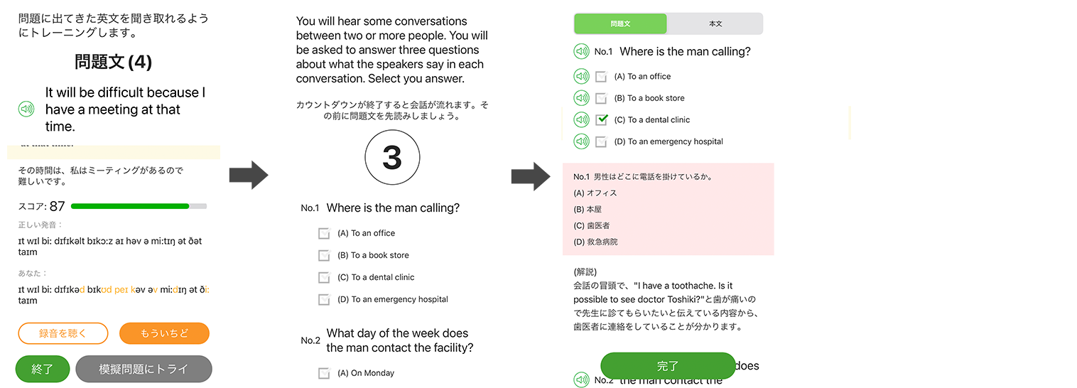 こちらの模擬問題集が非常に好評をいただきましたので、オリジナル学習コンテンツの更なる拡充の必要性を感じて、Part 3/Part 4 模擬問題集を追加搭載いたしました。