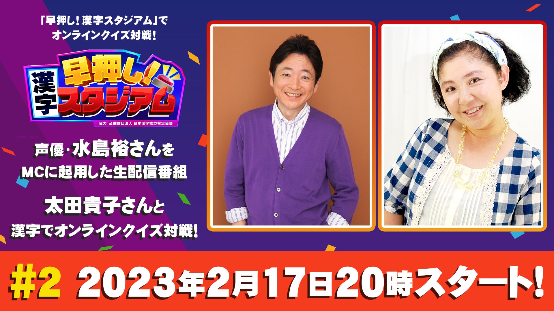 イマジニア株式会社(東京都新宿区、代表取締役社長 兼 CEO 澄岡和憲、以下「当社」)は、配信中のNintendo Switch™ダウンロード専用ソフト「早押し!漢字スタジアム」(以下「本作」)につきまして、声優の水島裕さんをMCに起用した生配信番組を配信中です。本日第二回の配信を行いますので、お知らせします。
