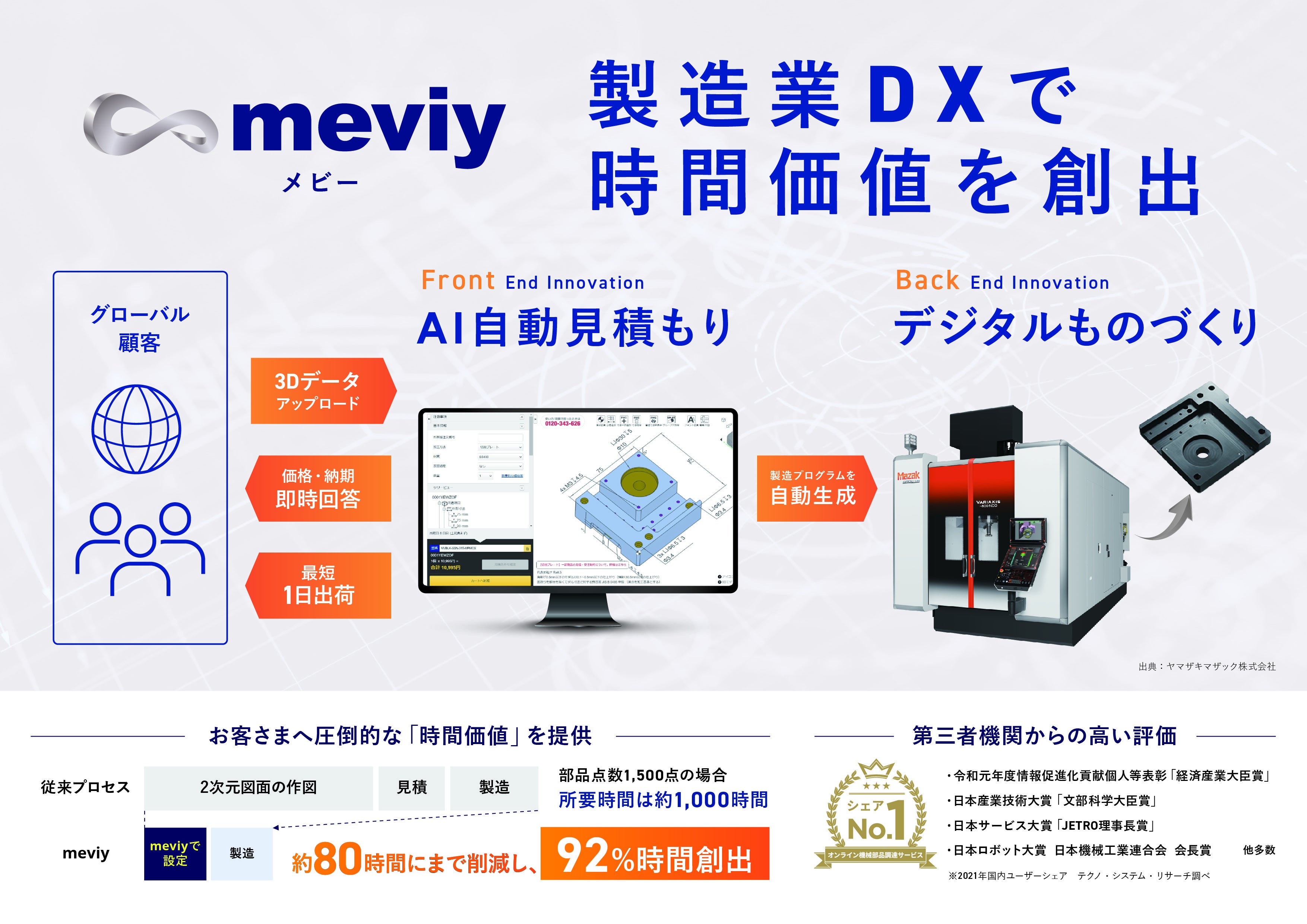 meviyは機械部品の3DデータをアップロードするだけでAIが自動で即時見積もり、独自のデジタル製造システムにより最短1日での出荷を実現します。これまで、機械部品調達時に発生していた作業時間の9割以上を削減することで、お客さまの部品調達における非効率を解消するプラットフォームです。3年連続で国内シェアNo.1※を獲得、第9回ものづくり日本大賞において「内閣総理大臣賞」を受賞し、製造業の生産性向上において高い評価を得ています。海外でのサービス提供も拡大しており、部品調達DXを通じた時間価値をグローバルで提供しています。