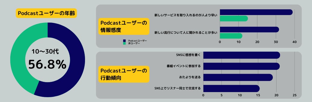 さらに、ターゲットの間で特に人気が高かった「ラジオ」を新規ユーザー獲得の柱としました。中でもPodcastはユーザーの過半数が30代以下の若年層で、情報感度が高い傾向にあります。また熱量が高いコンテンツでありながら、一人で聞いている人が多く、リスナー同士の交流を求めるなどの傾向もみられることから、コミュニティ形成のニーズを感じ、この度のPodcast番組の開始に至りました。
