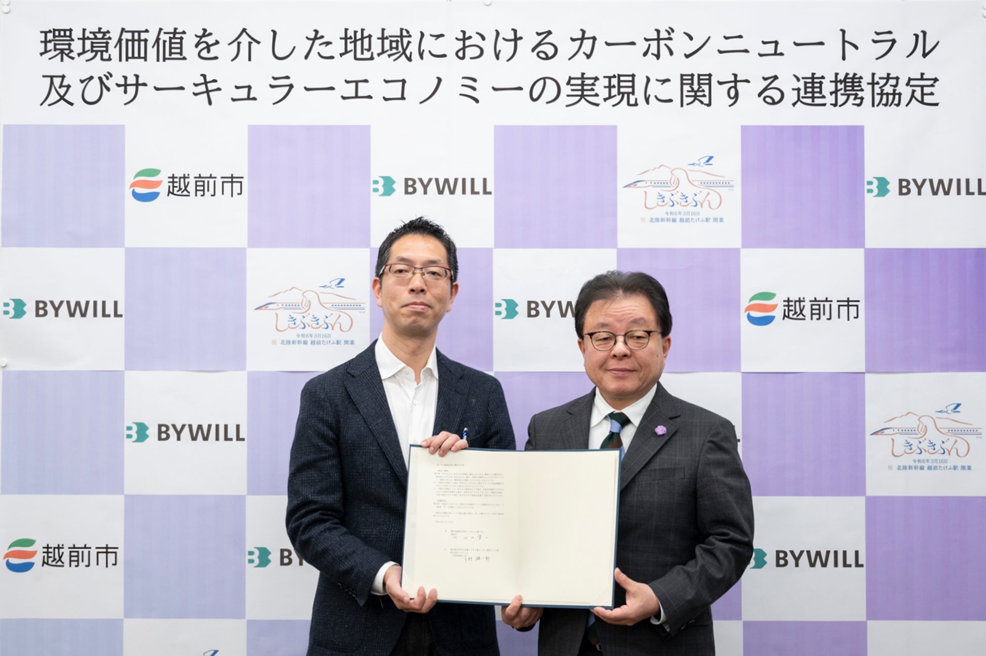 福井県越前市とバイウィルがゼロカーボンシティ実現に向け、J-クレジット等の環境価値に関する連携協定を締結