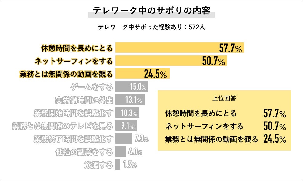 テレワーク中にサボった経験ありを回答した572人にサボりの内容を聞くと、「休憩時間を長めにとる」が57.7%で最多回答になり、次いで「ネットサーフィンをする」が50.7%、「業務とは関係ない動画を見る」が24.5%で上位3つの回答結果になりました。