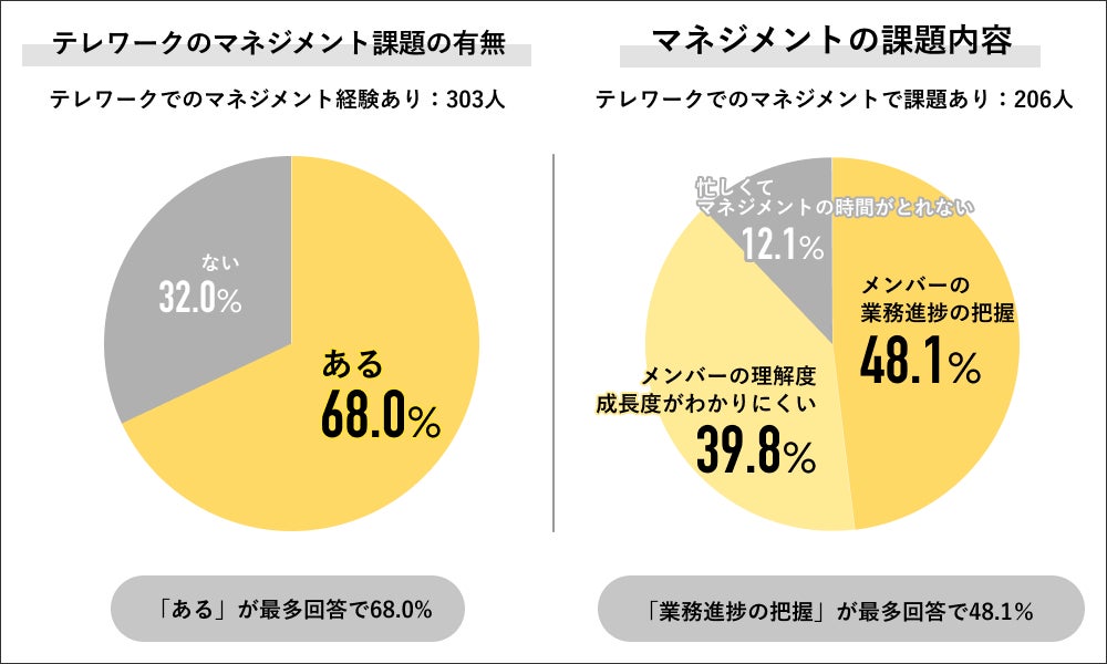 マネジメントポジションの303人にテレワークでのリモートマネジメントについて課題の有無を聞くと、「ある」が68.0%で「ない」が32.0%でした。また「ある」を回答した206人に課題の内容を聞くと、「メンバーの業務進捗の把握」が48.1%で最多回答になり、次いで「メンバーの理解度や成長度がわかりにくい」が39.8%、「忙しくてマネジメントの時間が取れない」が12.1%という結果になりました。
