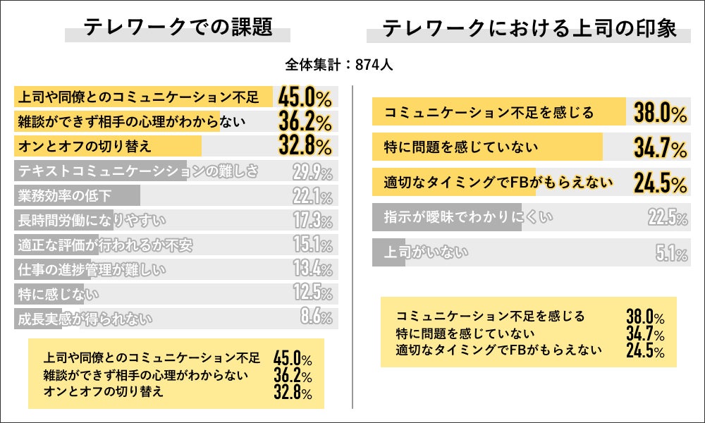 テレワークでの課題については、「上司や同僚とのコミュニケーション不足」が45.0%で最多になり、次いで「雑談ができず相手の心理がわからない」が36.2%、「オンとオフの切り替え」が32.8%で上位3つの回答結果になりました。またテレワークにおける上司の印象では、「コミュニケーション不足を感じる」が38.0%で最多回答になり、次いで「特に問題を感じていない」が34.7%、「適切なタイミングでフィードバックがもらえない」が24.5%で上位3つの回答結果になりました。