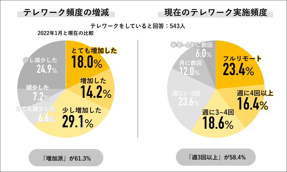 現在テレワークを実施している543人に昨年同月と比較したテレワークの増減を聞くと、「とても増加した」18.0%、「増加した」14.2%、「少し増加した」29.1%を合算した61.3%が”増加した派”の回答をしました。”減少した派”の回答は38.7%で、内訳は「とても減少した」6.6%、「減少した」7.2%、「少し減少した」24.9%でした。また現状のテレワークの頻度を聞くと、「フルリモート」23.4%、「週に4日以上」16.4%、「週に3〜4日」18.6%、「週に1〜2日」23.6%、「月に数回」12.0%、「半年〜1年に数回」6.0%で、フルリモートを含めて58.4%が週に3日以上テレワークを実施している結果になりました。