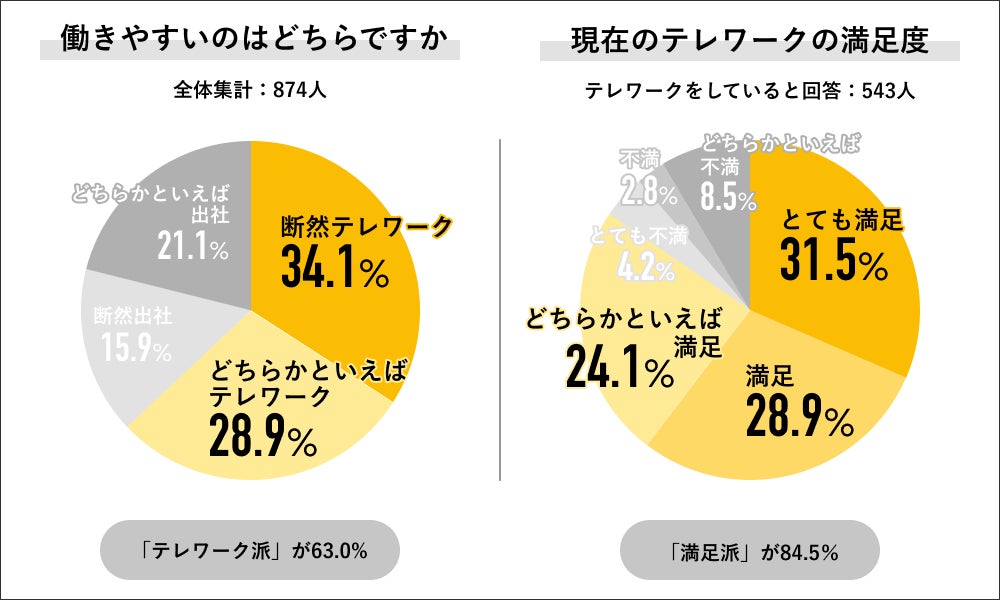 全体の874人に出社とテレワークどちらが働きやすいかについて聞くと、「断然テレワーク」34.1%、「どちらかといえばテレワーク」28.9%を合算した63.0%が”テレワーク派”を回答しました。また現在テレワークを実施している543人に満足度を聞くと「とても満足」31.5%、「満足」28.9%、「どちらかといえば満足」24.1%を合算した84.5%が”満足派”の回答をしました。