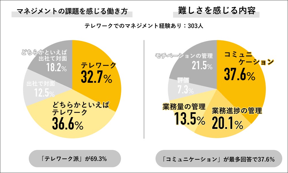 同じくマネジメントポジションの303人に、出社とテレワークどちらがマネジメント課題を感じるかを聞くと、「テレワーク」32.7%と「どちらかといえばテレワーク」36.6%を合算した69.3%が”テレワーク派”に回答しました。またリモートマネジメントで難しさを感じる事を聞くと、「コミュニケーション」が37.6%で最多回答になり、次いで「業務の進捗管理」が20.1%、「業務量の管理」が13.5%で上位3つの回答結果になりました。