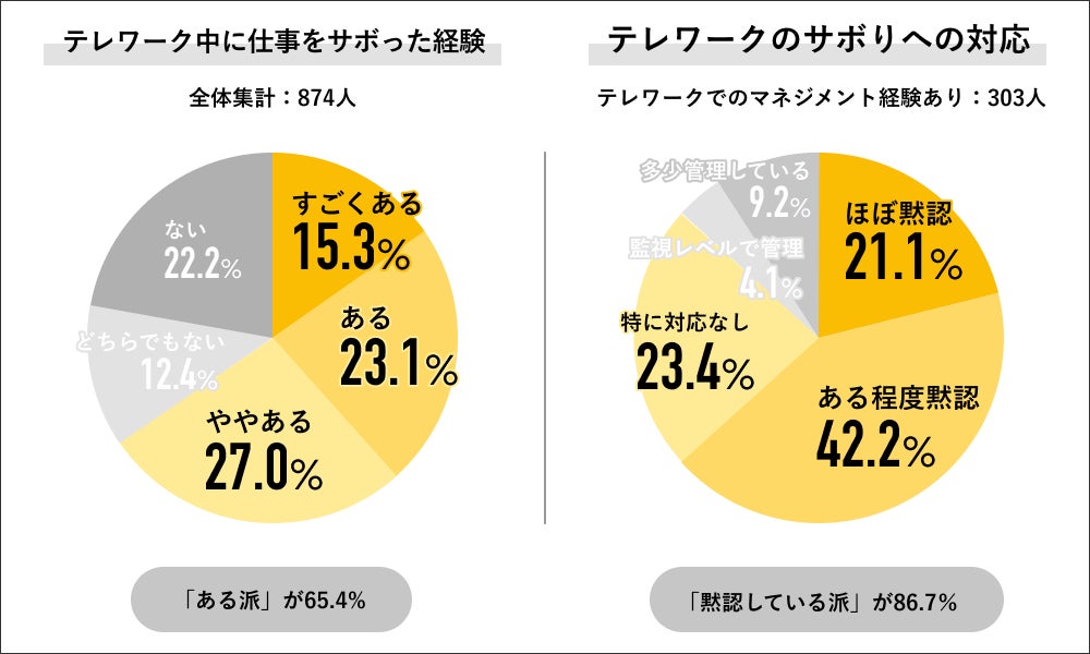 全体の874人にテレワーク中にサボった経験の有無を聞くと、「すごくある」15.3%、「ある」23.1%、「ややある」27.0%を合算した65.4%が”ある派”の回答をしました。またマネジメントポジションの303人に、テレワークでのメンバーのサボりへの対応では、「特に対応なし」23.4%、「ほぼ黙認している」21.1%、「ある程度黙認している」42.2%を合算した86.7%が”黙認している派”の回答をしました。