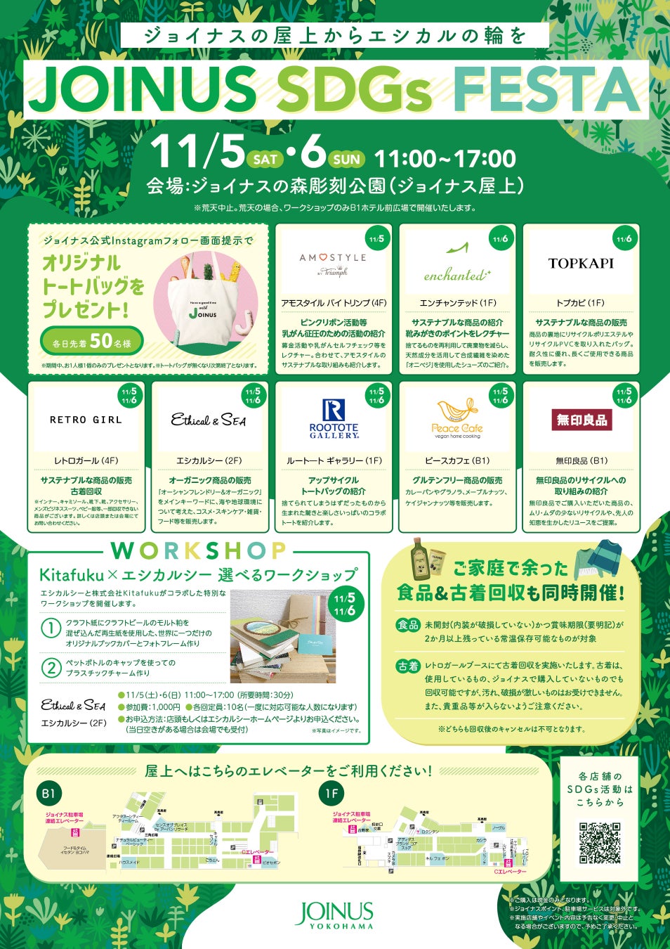 緑あふれる「ジョイナスの森彫刻公園」を活用し、エシカルを楽しく考えるイベントを開催!ジョイナスから8店舗が参加し、サステナブルな暮らしにピッタリのアイテムを展示・販売します。また、エシカルセレクトショップ「エシカルシー」の特設ブースでは、再生紙を使用した世界に一つだけのオリジナルブックカバーやフォトフレーム作成など、SDGsに触れ合える体験型ワークショップをご用意しています。さらに、ご家庭で余った食品&古着回収を同時に実施する他、ジョイナス公式Instagramのフォロー画面を提示いただくと、各日先着50名様にジョイナスオリジナルトートバッグをプレゼントします。