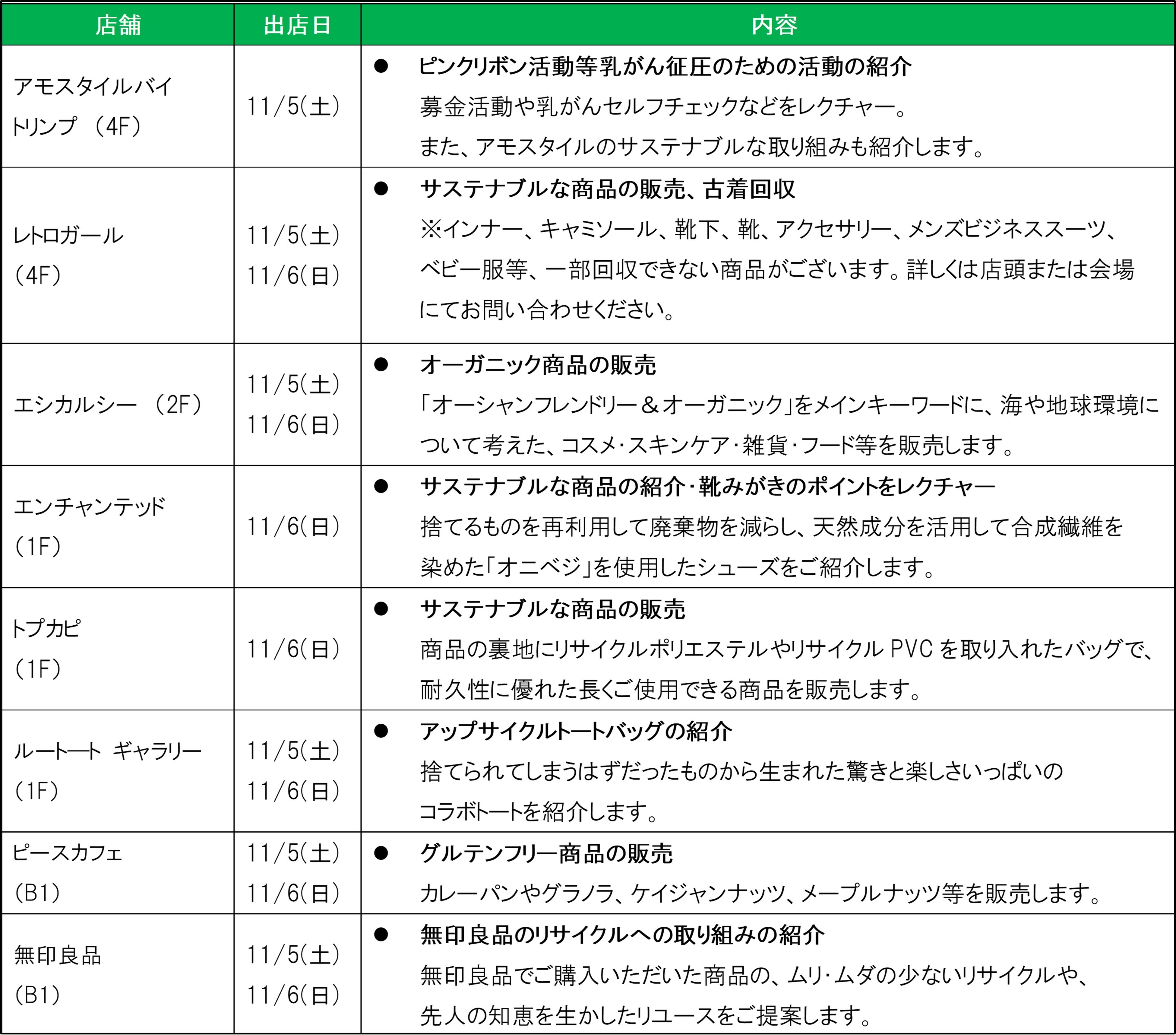 ジョイナスから8店舗が参加し、サステナブルな社会づくりに取り組むアイテムを販売・展示します。