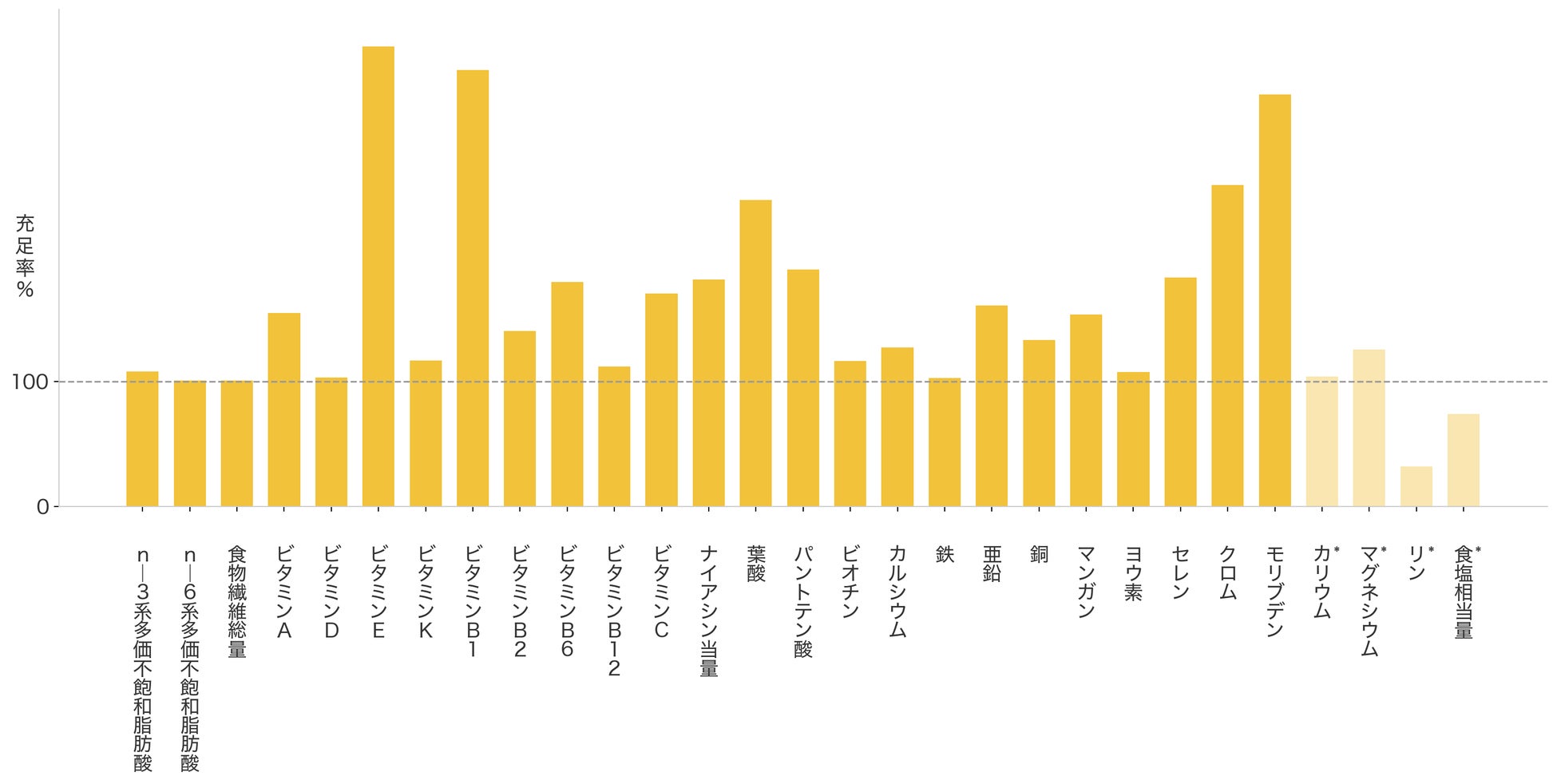 n-3系・n-6系必須脂肪酸、食物繊維、26種のビタミン・ミネラルも、バランスよく配合しました。