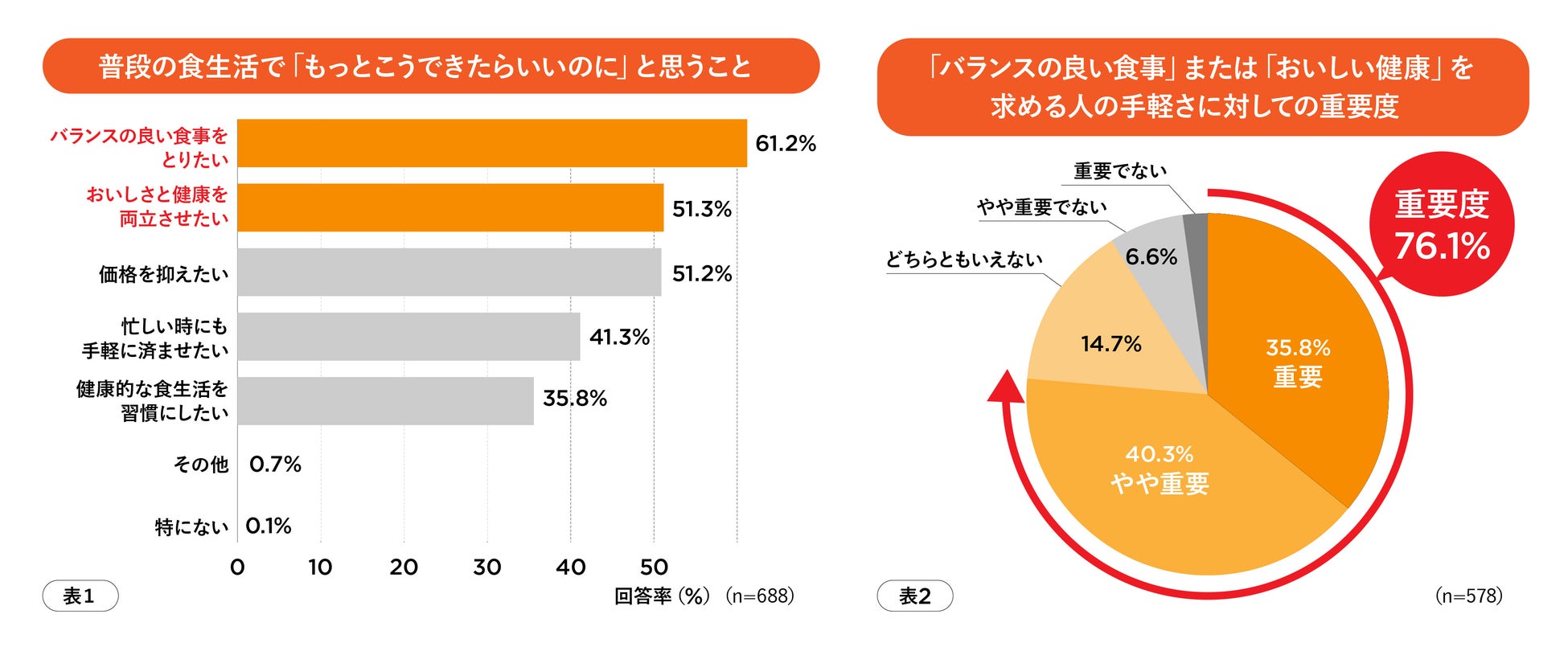近年はたらく世代の食生活が多様化するなか、健康や栄養バランスを意識した食事への関心が高まっています。弊社の調査(*1)によると、普段の食生活で「バランスの良い食事をとりたい」と思う方は全体の61.2%、「おいしさと健康を両立させたい」と考えている方が51%いることがわかりました。(表1)