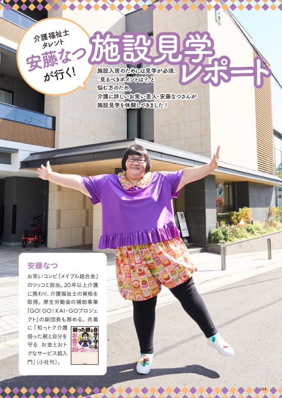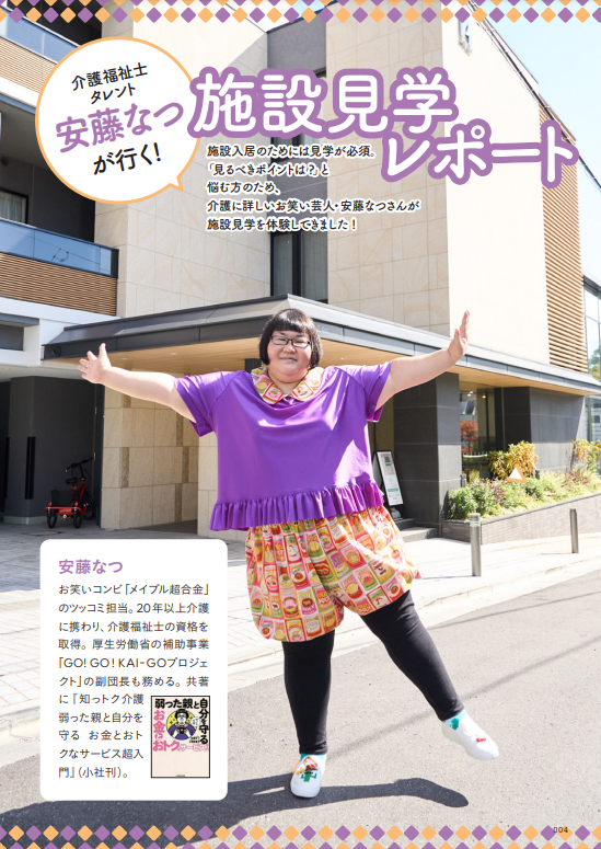 また、お笑いタレント・メイプル超合金の安藤なつさんによる施設体験リポートを掲載。介護福祉士の資格を持つ安藤さんが、見学時のポイントを紹介しながら、介護の楽しさややりがいなどについて語ります。