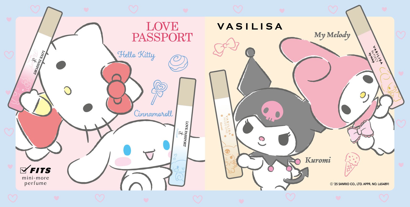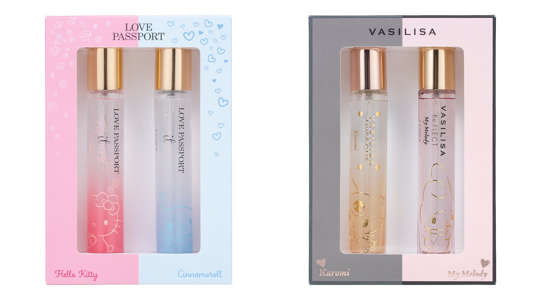 「ラブ パスポート」とコラボレーションした「ハローキティ」「シナモロール」デザインのコフレは、大人ガーリーなパステルカラーを基調としたパッケージ。「ヴァシリーサ」とコラボレーションした「クロミ」「マイメロディ」デザインのコフレは、アースカラーを基調とし、エレガントな印象のデザインとなっています。