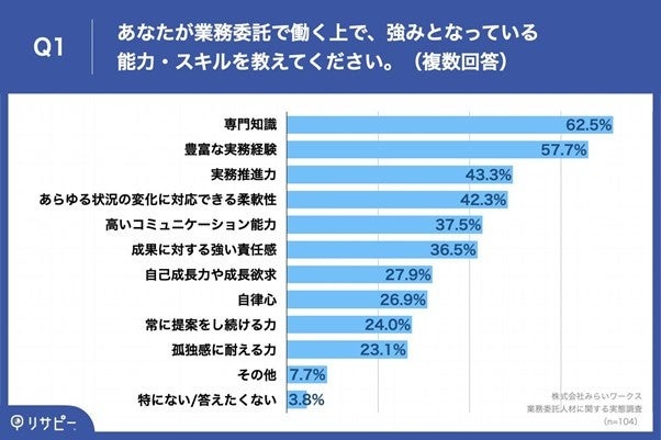 「Q1.あなたが業務委託で働く上で、強みとなっている能力・スキルを教えてください。(複数回答)」(n=104)と質問したところ、「専門知識」が62.5%、「豊富な実務経験」が57.7%、「実務推進力」が43.3%という回答となりました。