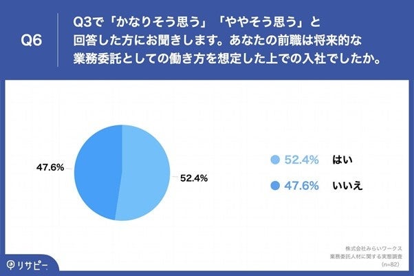 Q3で「かなりそう思う」「ややそう思う」と回答した方に、「Q6.あなたの前職は将来的な業務委託としての働き方を想定した上での入社でしたか。」(n=82)と質問したところ、「はい」が52.4%、「いいえ」が47.6%という回答となりました。