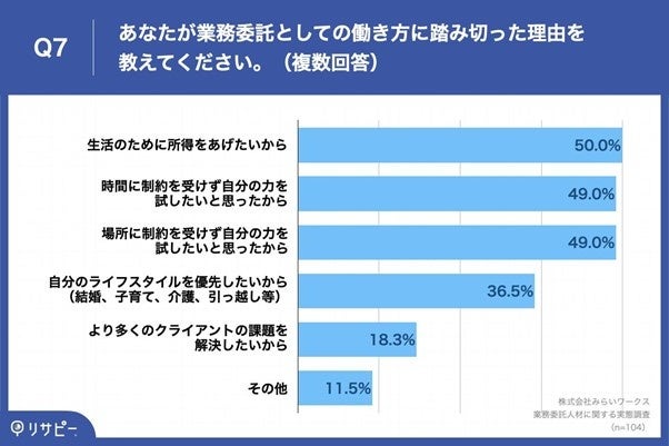 「Q7.あなたが業務委託としての働き方に踏み切った理由を教えてください。(複数回答)」(n=104)と質問したところ、「生活のために所得をあげたいから」が50.0%、「場所に制約を受けず自分の力を試したいと思ったから」が49.0%、「時間に制約を受けず自分の力を試したいと思ったから」が49.0%という回答となりました。