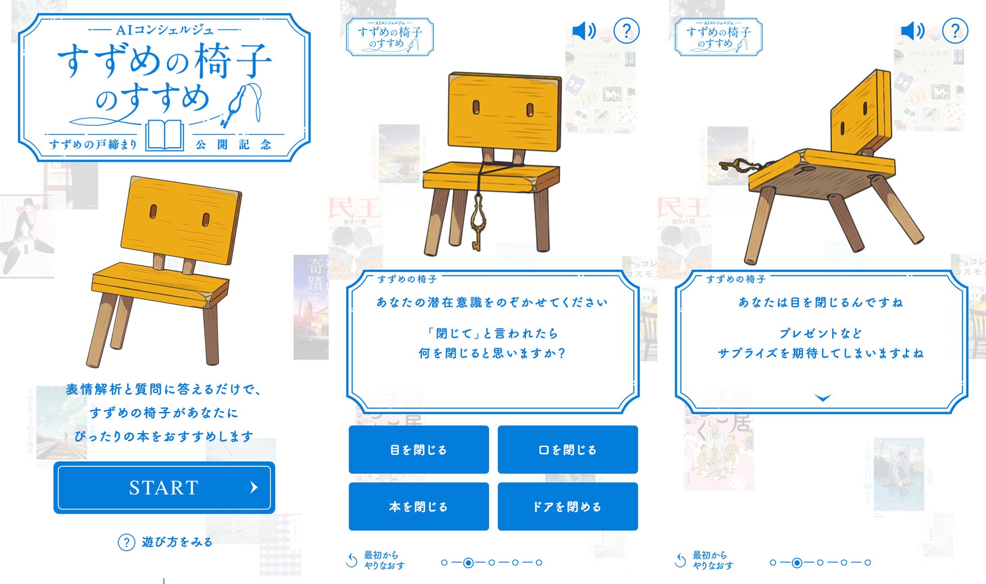 『小説 すずめの戸締まり』のキャラクター「すずめの椅子」がAIとなって作中同様の姿とアクションで画面に登場します。体験者へ興味を示す「すずめの椅子」の可愛いリアクションを愉しみながら対話を進めてゆくと、体験の最後に「すずめの椅子」から、いまの自分にぴったりの1冊をオススメされます。