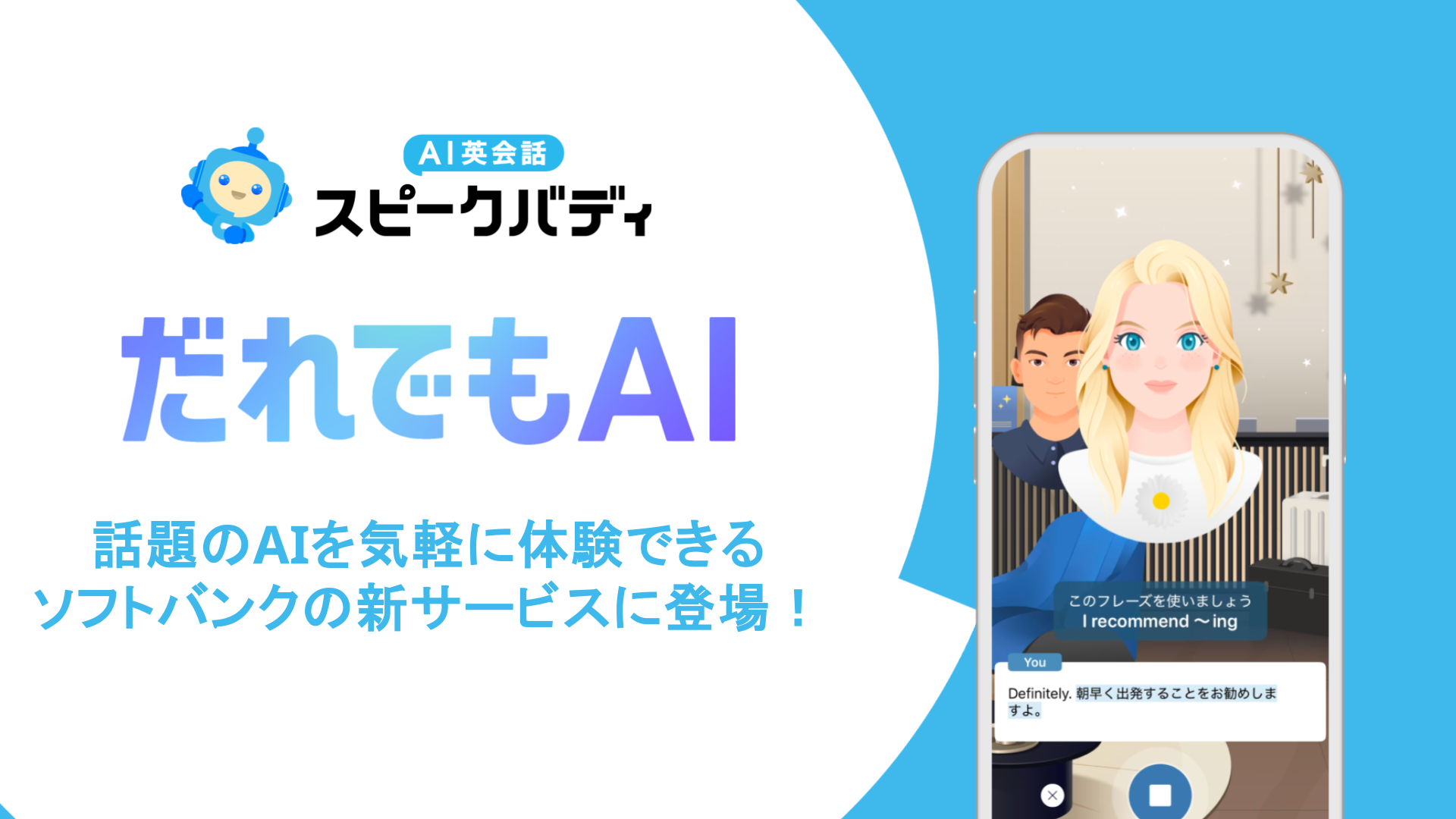 株式会社スピークバディ(本社:東京都中央区、代表取締役CEO:立石剛史、以下「当社」)は、ソフトバンク株式会社(以下「ソフトバンク」)が本日より新たに提供する、話題のAIを簡単な操作で気軽に体験できるサービス「だれでもAI」に、当社が開発・運営する「AI英会話スピークバディ」が登場することをお知らせします。