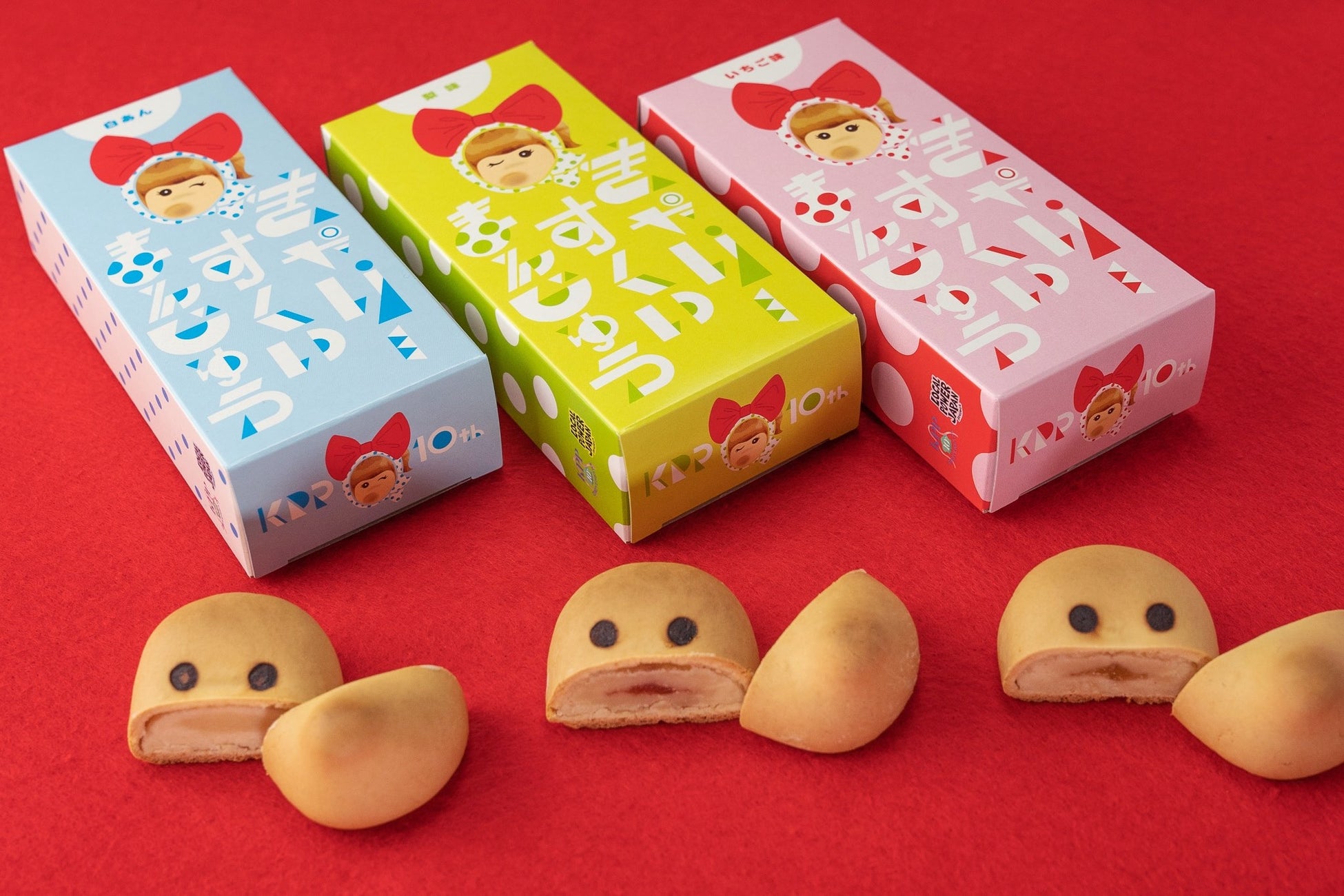 そして今回のコラボ商品の名前は、「どじょう掬いまんじゅう」ならぬ「きゃりーすくいまんじゅう」に決定した。定番の「白あん」と、公演が行われる安来産のいちごを使用した「いちご味」、山陰名産の「二十世紀梨」を使用した「梨味」の3つのフレーバーが各2個ずつ、それぞれ青・ピンク・黄緑のオリジナルBOXに入り、3箱セットで販売される。箱の表面にはきゃりー風のひょっとこのイラストが大きく描かれ、とてもポップなデザインと色合いになっている。