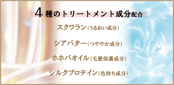 浸透ディープカラー処方で、白髪と黒髪のなじみ具合をUP※!黒髪は明るく、白髪は鮮やかにバランス良く染め上げます。ヘアカラー剤には4種のトリートメント成分を配合。ツヤと潤いのある髪色が続きます。また、ヘアカラー前と後のWトリートメントで傷んだ髪を補修し、髪と頭皮を保護しながらしっとりツヤのあるキレイな髪へと導きます。全色パッケージデザインもリニューアルしましたので、ぜひ店頭で手にとってご覧ください。※当社従来ヘアカラー(クレオディーテ ヘアカラー エマルジョン)比