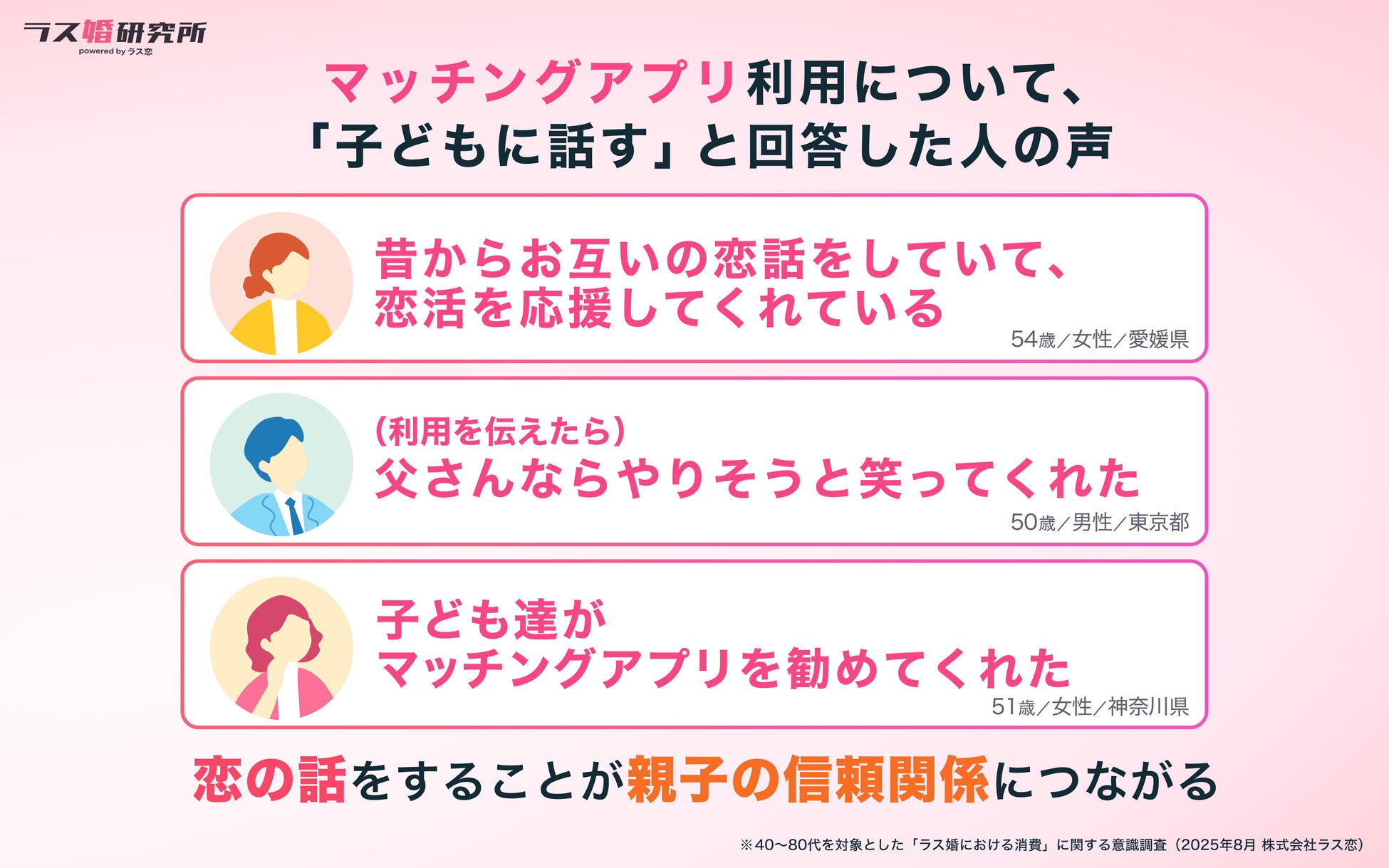 代表的なコメントには、「昔からお互いの恋話をしていて、恋活を応援してくれている。(54歳/女性/愛媛県)」「子ども達がマッチングアプリを勧めてくれたから(51歳/女性/神奈川県)」「(利用を伝えたら)父さんならやりそうと笑ってくれた(50歳/男性/東京都)」などがあり、恋を語ることが自然であり、会話することが親子の信頼関係や安心感につながっていることがうかがえます。