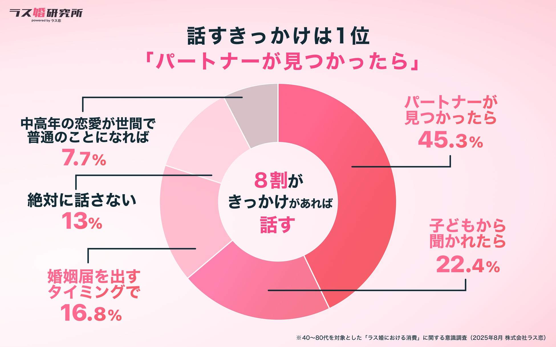 一方「話したくない」理由の最多は「自分自身の人生だから(46.8%)」となり、敬老の日を前に、子の親や祖父母であっても「主体的に恋を楽しめる」令和の中高年像が浮かび上がりました。