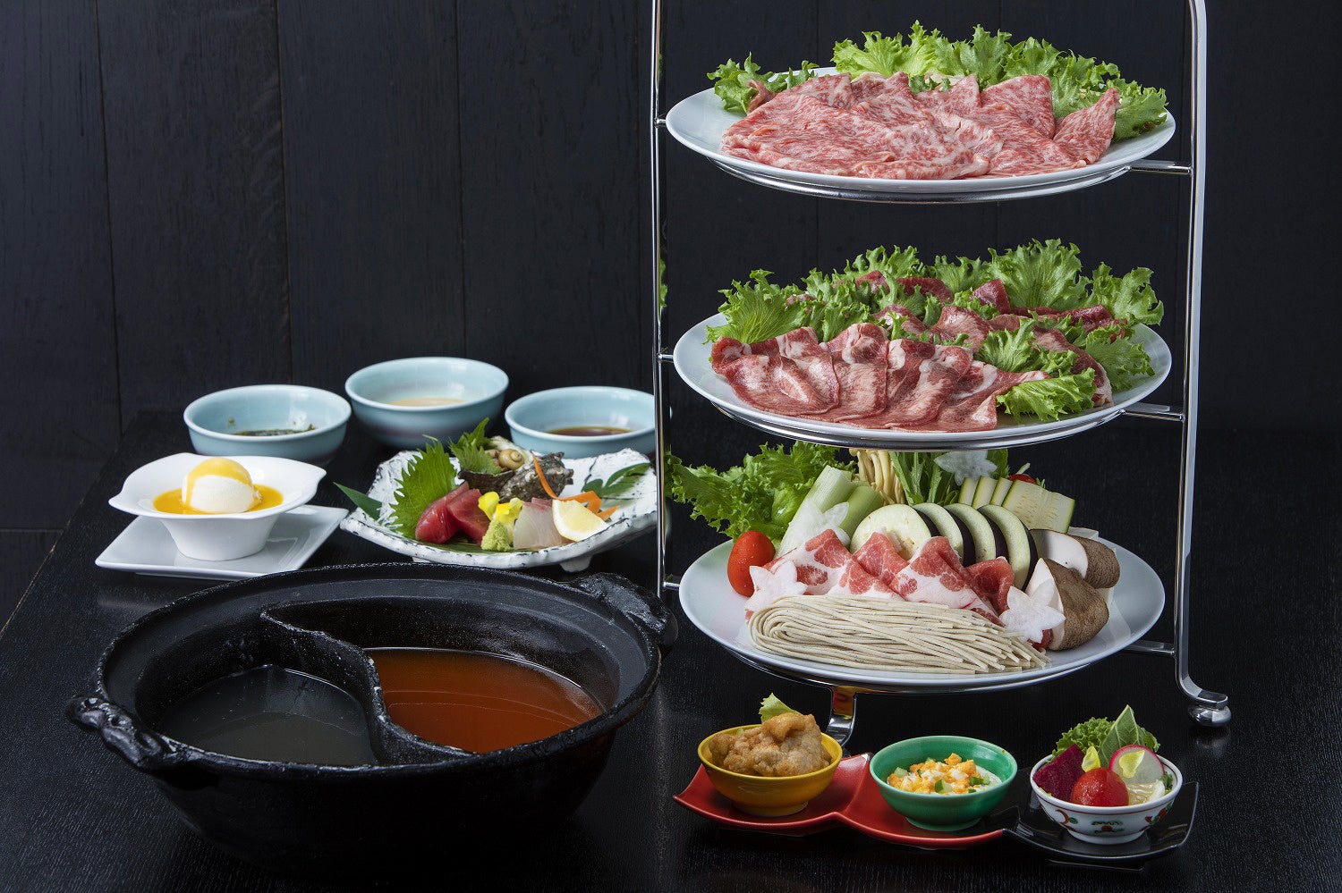 宮崎の美味しいお肉や秋の野菜など、素材そのものの味を堪能するしゃぶしゃぶ。宮崎牛サーロインなどが美しく盛られた“肉タワー”の見た目もお楽しみください。