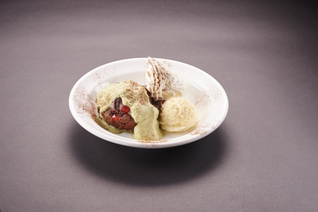 『スイート ヒート チョコレートケーキ』は、デザートよりもお肉が大好き!という、「トニーローマ」ファンのリクエストに応え、チョコレートの甘さにスパイシーな味わいをプラスしたブラウニーケーキです。チョコレートに合わせて使用しているのは、2500年もの歴史を持つ都市・チョルーラに由来するメキシコ生まれの旨辛ソース “チョルーラホットソース”。その特徴である辛さではなく、爽やかなフレーバーを引き立たせ、チェリーの程よい甘酸っぱさと、チョコレートの甘い口当たりの後にくるピリッとくるアクセントを楽しんでいただけるデザートに仕上げました。香り豊かなバジルクリームソース、バニラアイスと一緒にお召し上がり下さい。