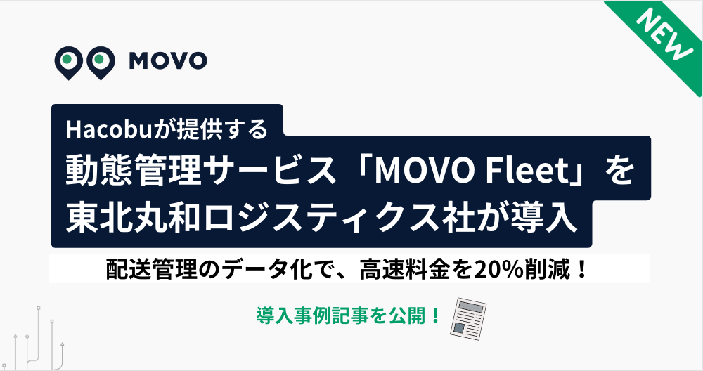 「運ぶを最適化する」をミッションに掲げる株式会社Hacobu(ハコブ、本社:東京都港区、代表取締役社長CEO 佐々木太郎、以下「Hacobu」)は、株式会社東北丸和ロジスティクスが、動態管理サービスMOVO Fleet(ムーボ・フリート)を導入し、物流DXを推進した導入事例記事を公開しましたのでお知らせいたします。