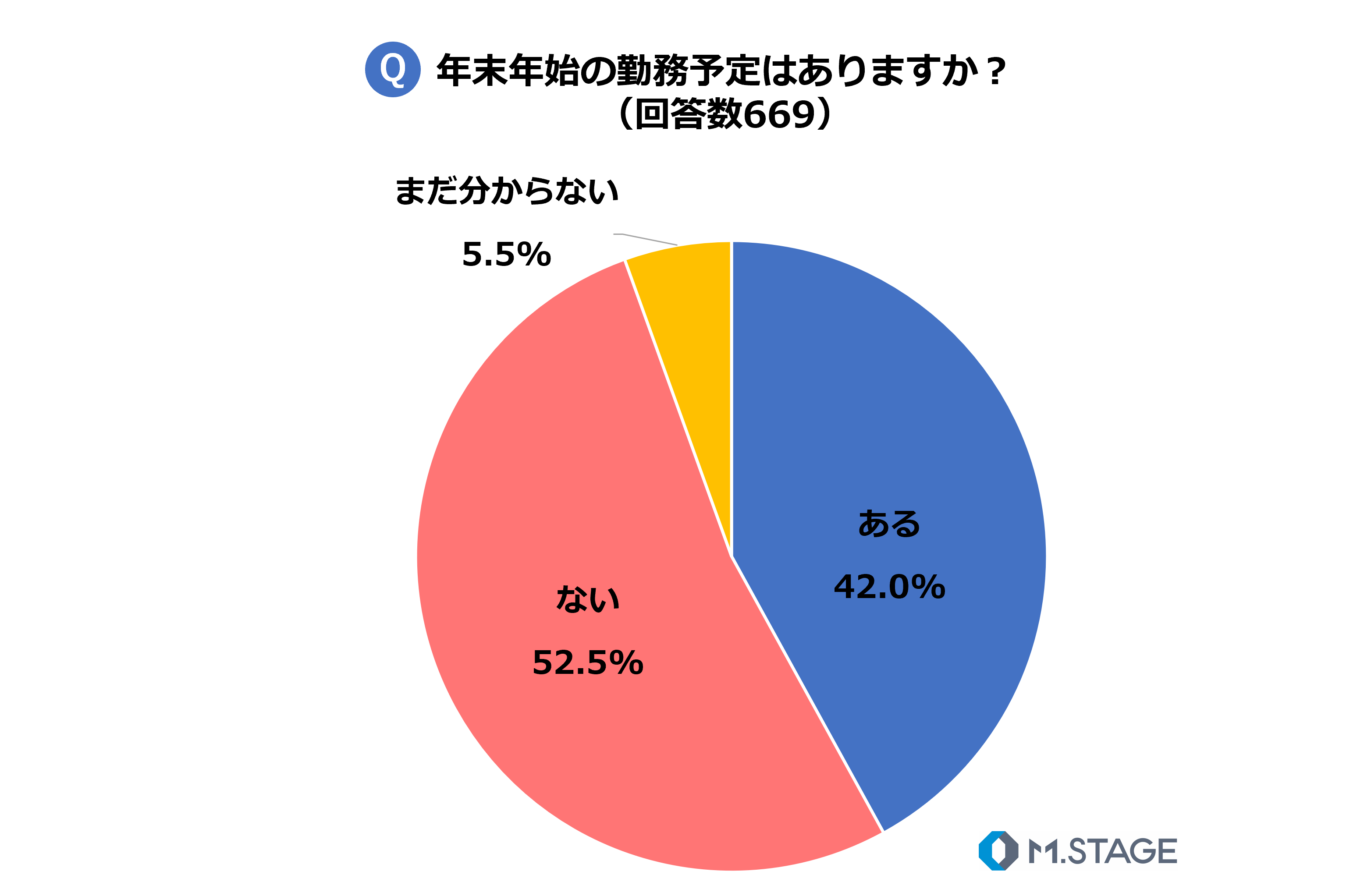 年末年始の勤務予定について質問したところ、最も多かったのは「勤務予定がない」(52.5%)で、次いで「勤務予定がある」(42%)、「まだ決まっていない」(5.5%)の順に多くなりました。