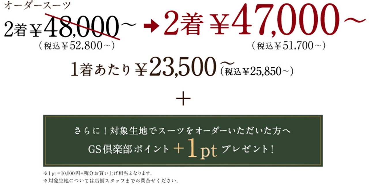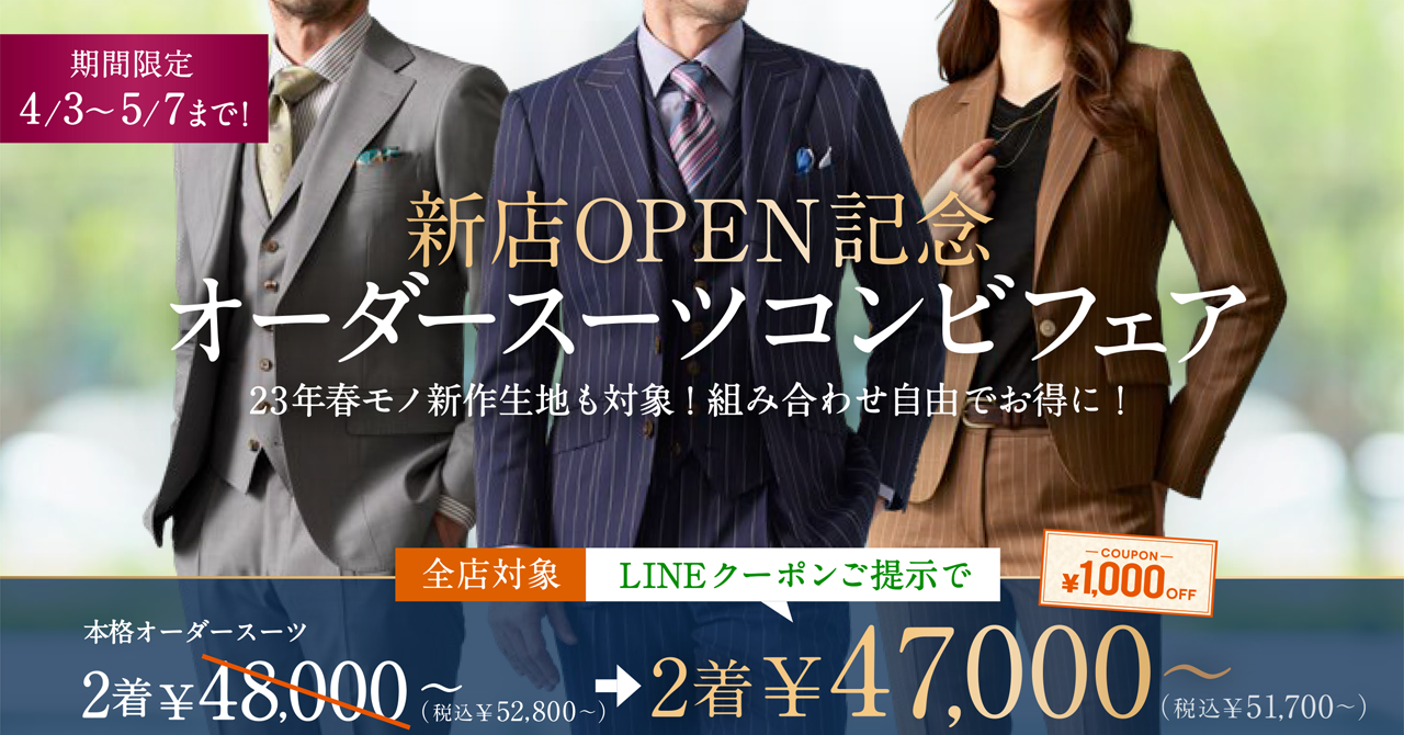 本格オーダースーツが新店OPEN記念クーポンで2着¥47,000~(税込¥51,700~)全店で開催!