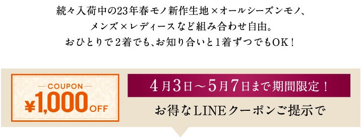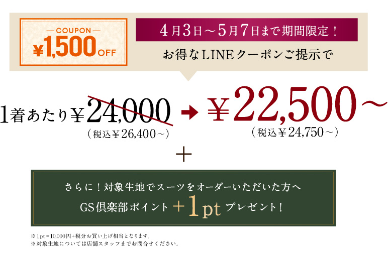 オーダースーツ専門店「GINZAグローバルスタイル」を運営するグローバルスタイル株式会社(東京証券取引所 スタンダード市場:7126、本社:大阪市中央区、代表取締役社長 田城弘志)は、4月3日~5月7日までの期間中、オーダースーツ2着ご購入で1,000円引きのクーポンをプレゼントする「新店OPEN記念オーダースーツコンビフェア」を全店で開催。