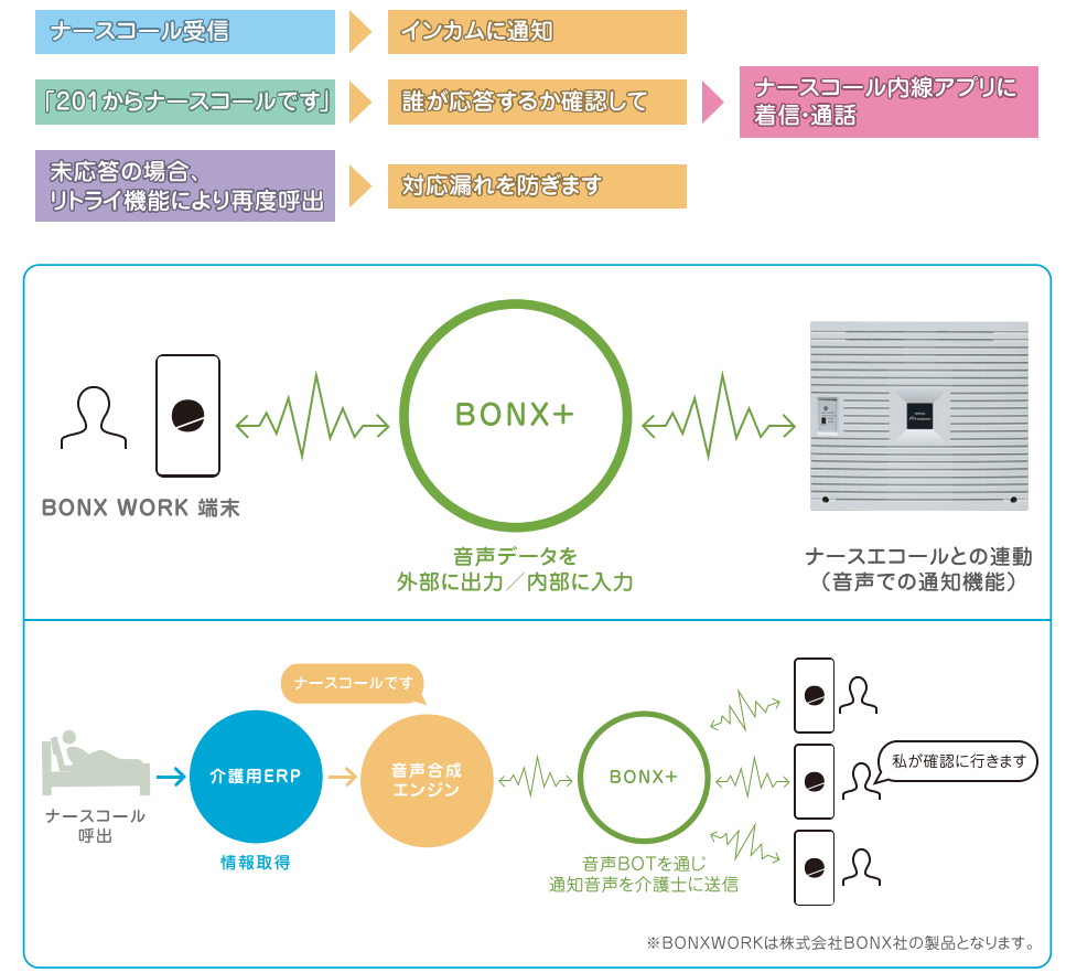 株式会社BONX(東京都渋谷区、代表取締役 宮坂貴大、以下「BONX」)はグループトークソリューション『BONX WORK』と電話設備一体型のナースコールシステム『ナースエコール』とを提供する名電通株式会社(名古屋市、代表取締役 中村道夫、以下「名電通」)との共同開発により、ナースエコールからの呼び出しがBONX音声APIを通じて、ユーザー装着のイヤホンマイクへと音声で通知され確認、イヤホンマイクにて応答・通話が可能となり、終話後には自動でグループトークへと復旧できるスマートソリューションを11月21日より発売いたします。