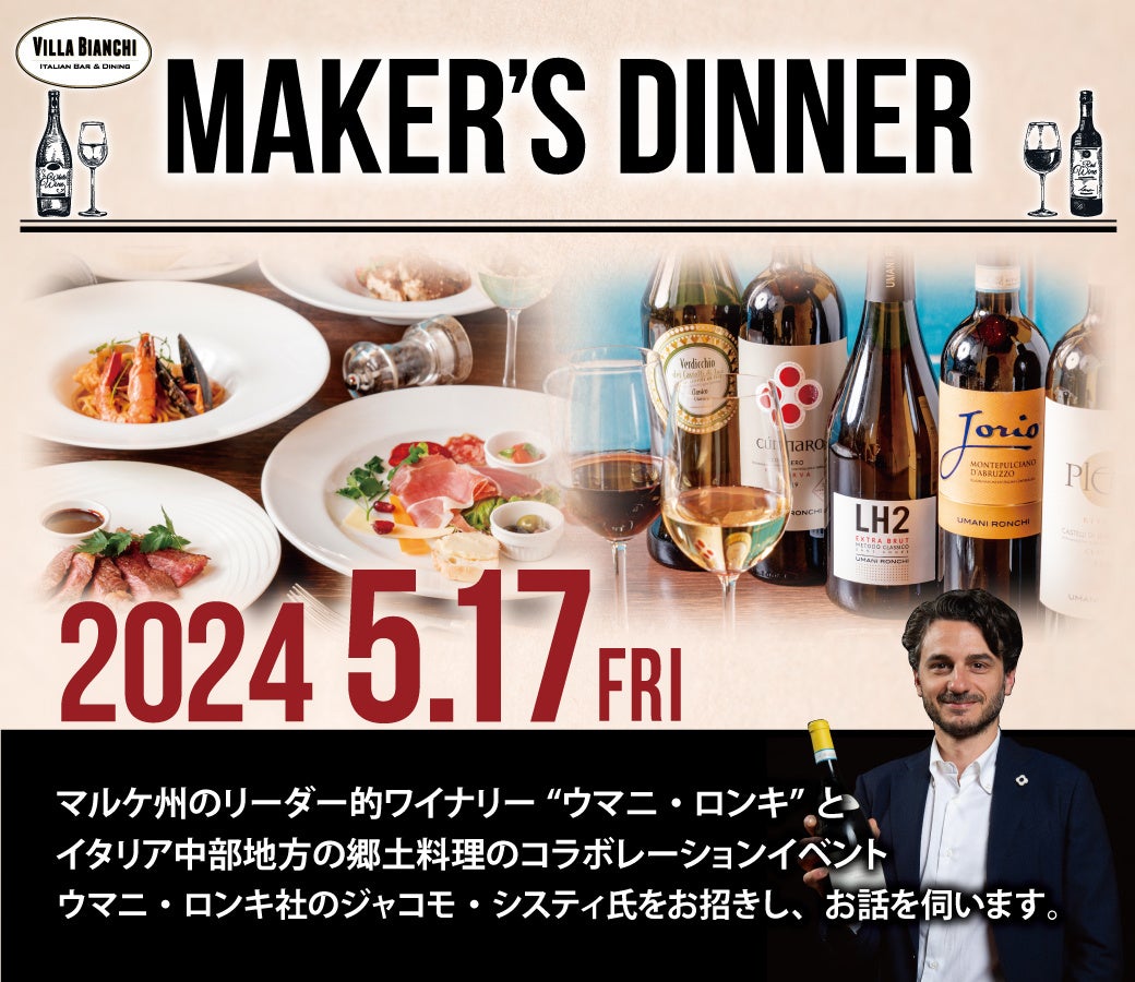 株式会社ダイナック(本社:東京都港区、代表取締役社長:綾野喜之)が運営する『ビラビアンキ新宿店』は、イタリア・マルケ州のリーダー的なワイナリー『ウマニ・ロンキ社』より日本輸出担当として活躍するエリアマネージャーのジャコモ・システィ氏をお招きし、2024年5月17日に一夜限りのメーカーズディナーを開催いたいます。