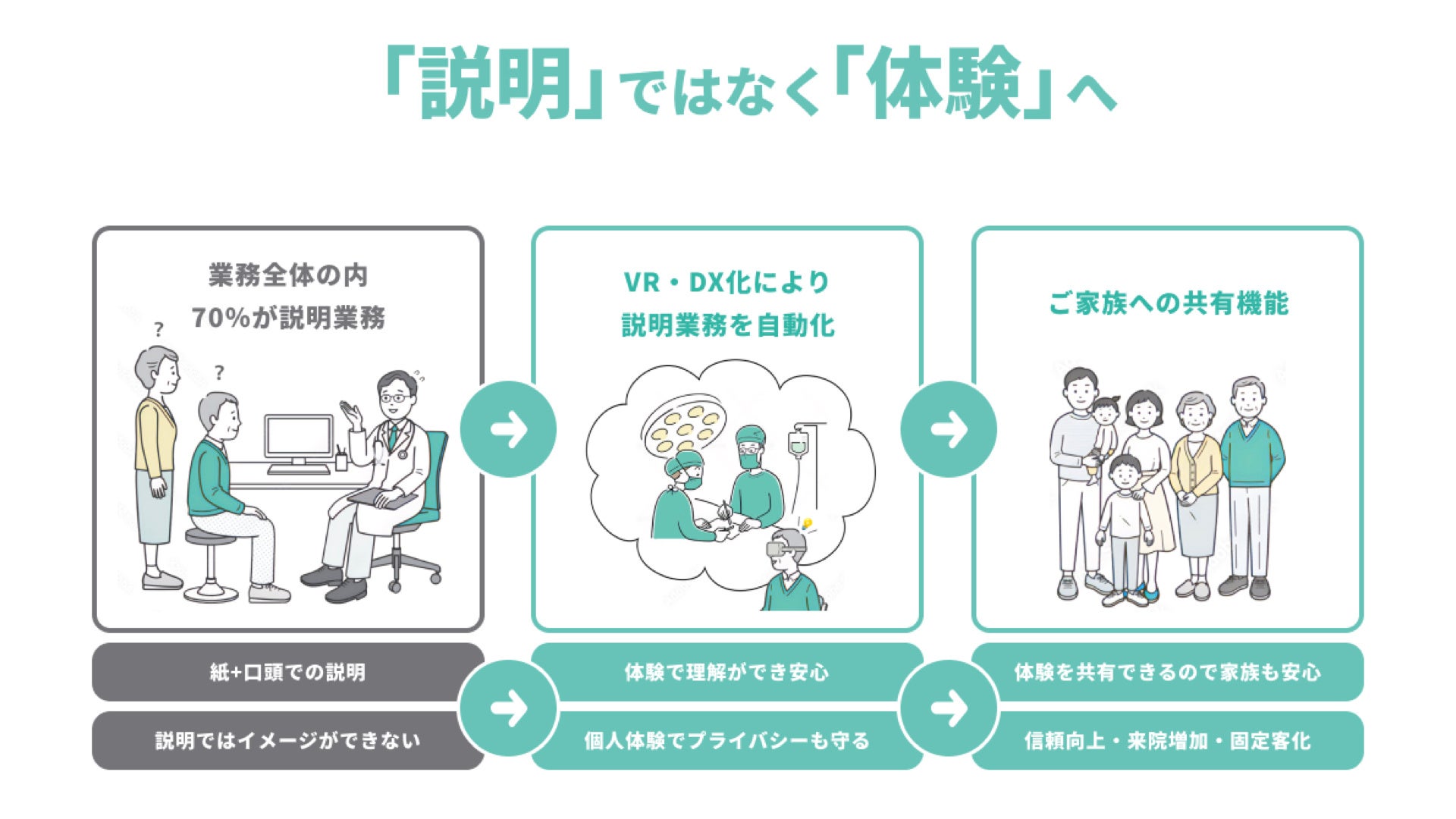 本サービスは、病院スタッフのデイリー業務の約7割を占めると言われる、紙文書と口頭による患者さんへの治療説明をVR体験化し、当事者目線のVRで治療の流れやリスクなどを体感してもらうことで、未知の治療に対する不安を軽減します。日々高齢化する患者の方々への治療説明を、文章ではなく「体験化」することで治療の理解やイメージを促進し、ご家族への共有をDXで円滑にすることで、病院の信頼向上と来院患者の増加、病院黒字化への貢献を実現します。また、これらの治療リスクや合併症の説明が不十分だったために起こる医療訴訟へのリスクを低減します。